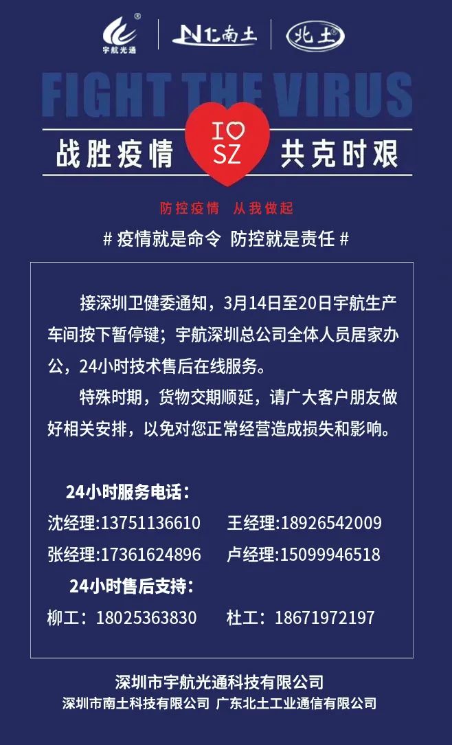 疫情就是命令,防控就是責任,接深圳衛(wèi)健委通知,宇航工業(yè)交換機生產車間按下暫停鍵,給全體合作伙伴造成不便敬請諒解。暫停是為了更好的開始,深圳加油,中國加油!