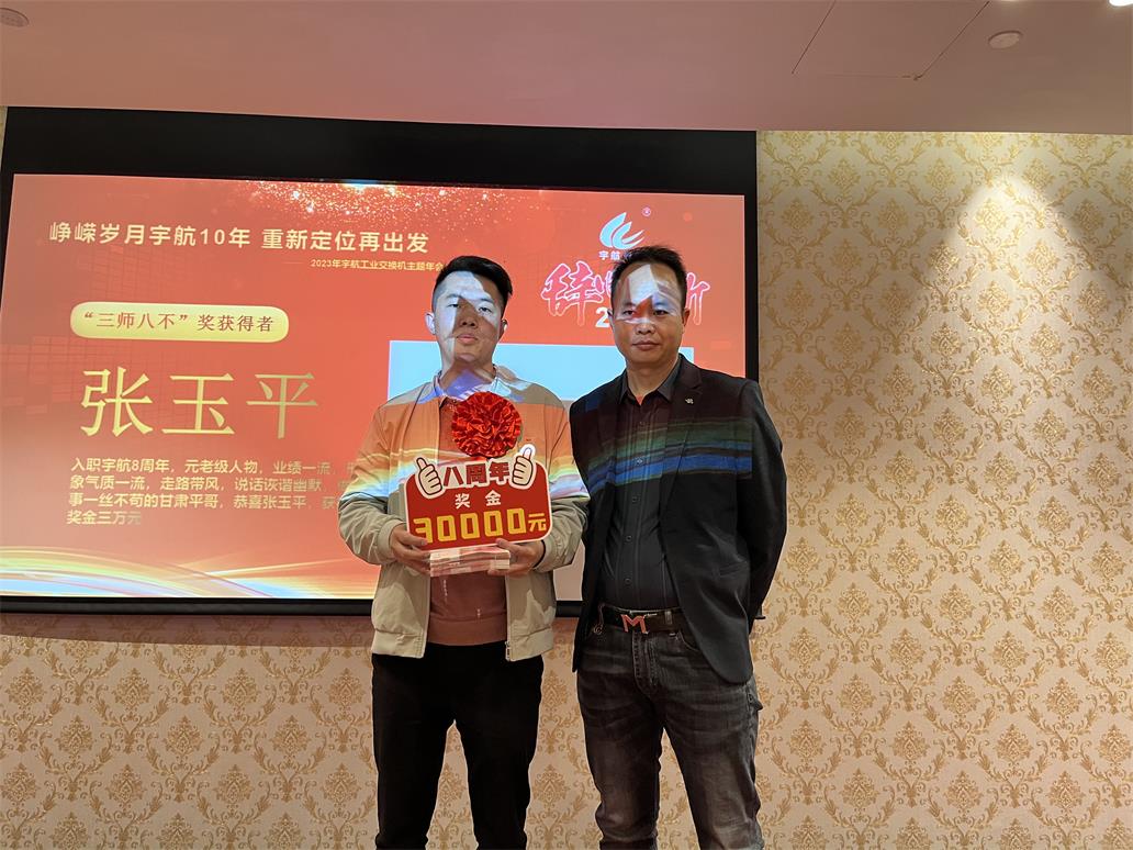 張玉平—入職宇航八周年獎,獎勵現(xiàn)金三萬元。張玉平作為公司的元老級人物,不僅業(yè)績一流,而且形象氣質(zhì)更是一流,高大帥氣,走路帶風(fēng),說話詼諧幽默,做事一絲不茍。
