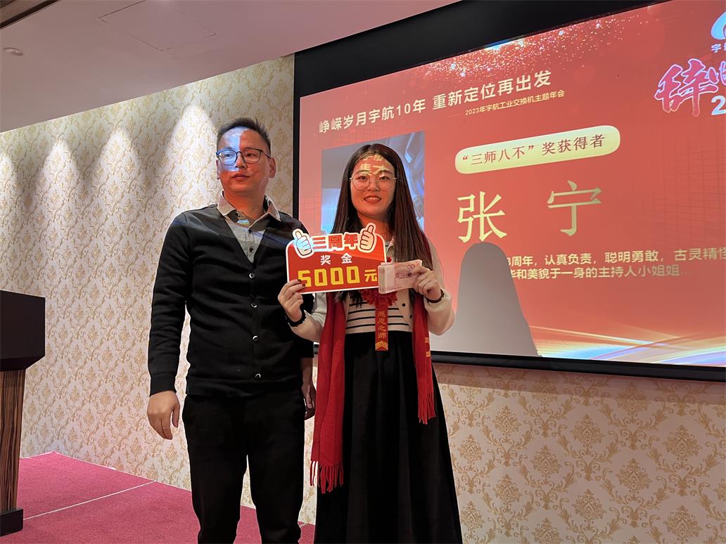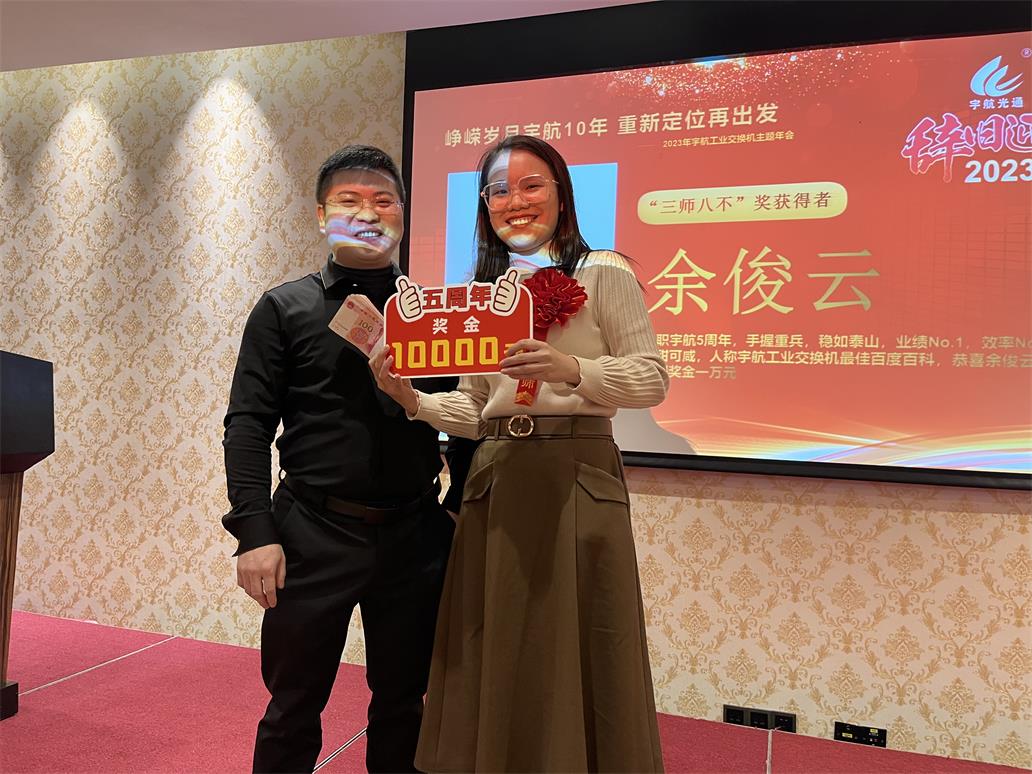 余俊云—入職宇航五周年獎,獎勵現(xiàn)金一萬元。手握重兵,穩(wěn)如泰山,業(yè)績No.1,效率No.1,可甜可咸,人稱宇航工業(yè)交換機最佳百度百科。