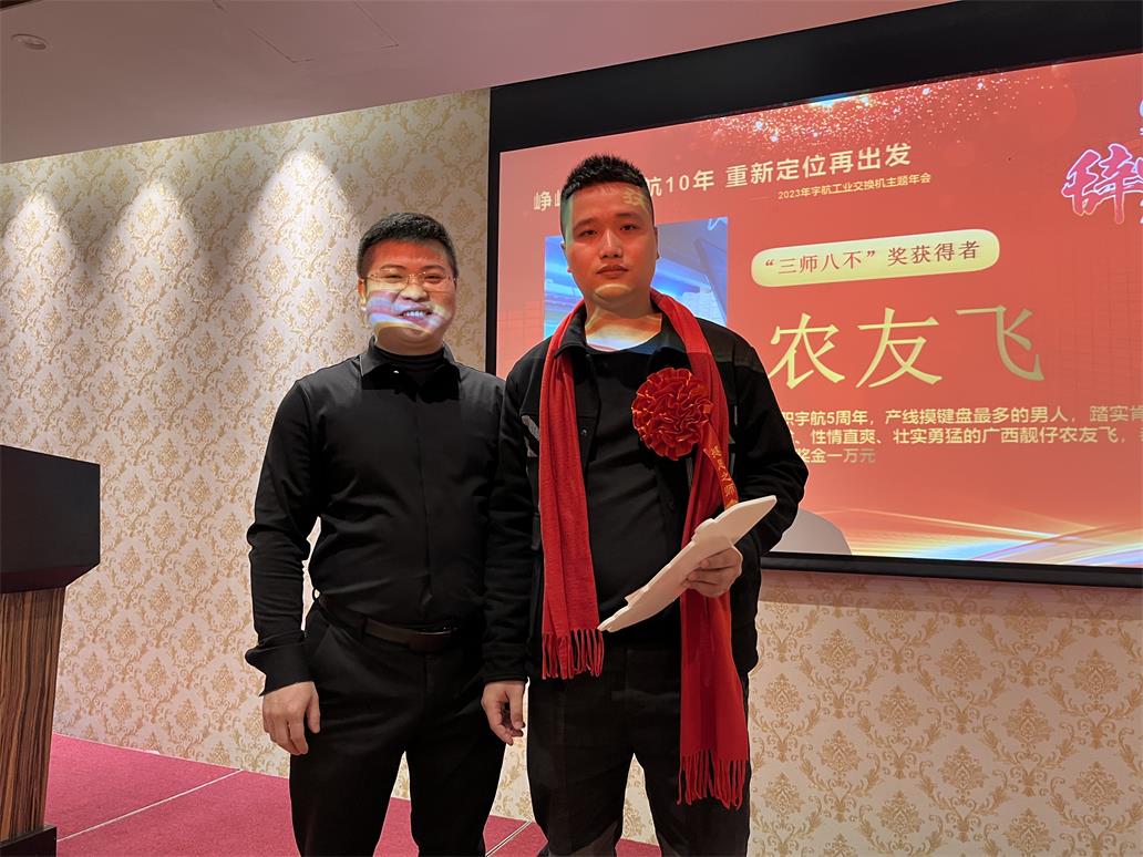 農(nóng)友飛—入職宇航五周年獎,獎勵現(xiàn)金一萬元。這是產(chǎn)線摸鍵盤最多的同事,只要有訂單下來,就認(rèn)認(rèn)真真的打好標(biāo)簽,踏實肯干、心細如發(fā)、性情直爽、壯實勇猛的廣西靚仔。
