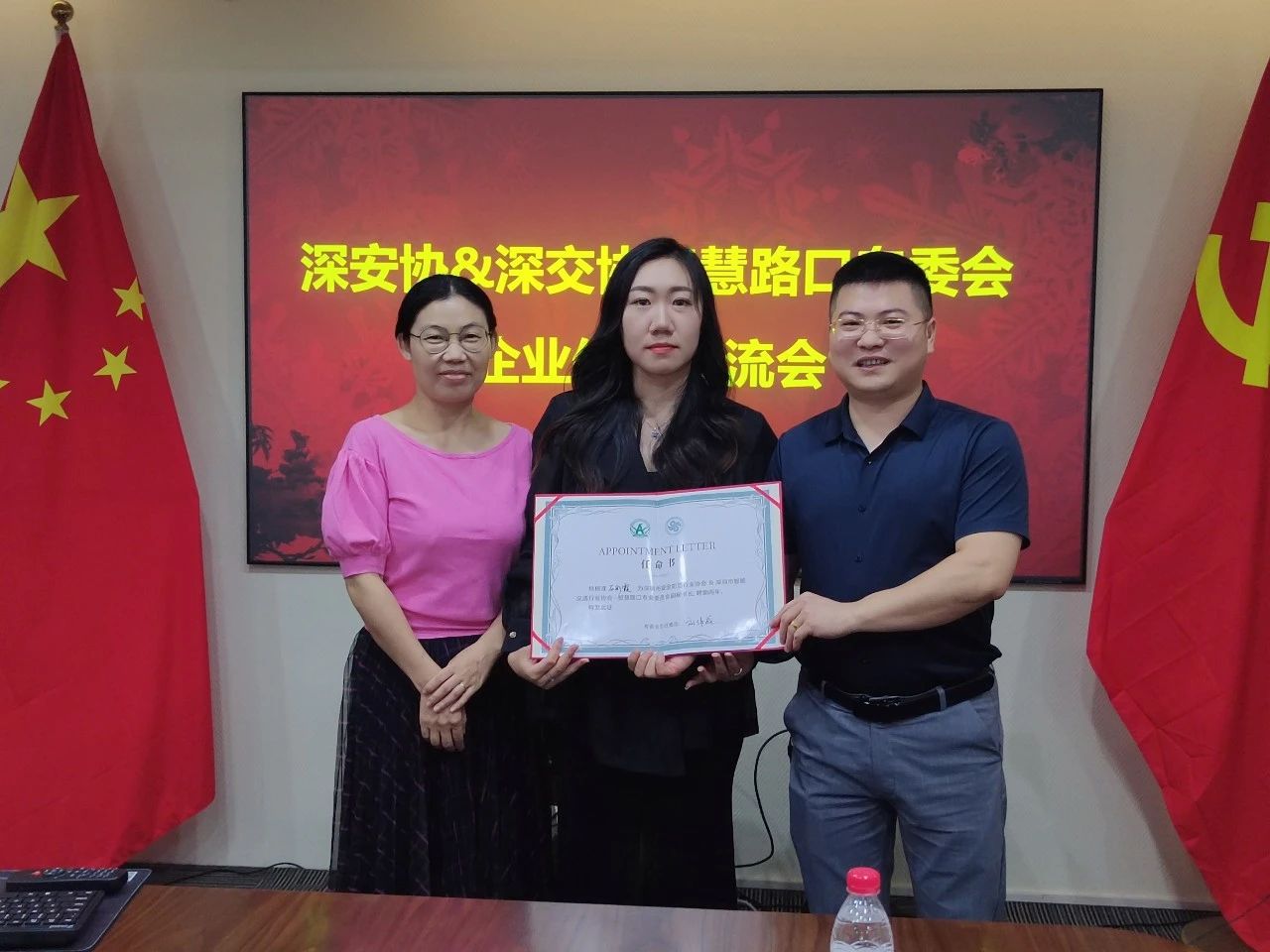 圖為深安協(xié)&深交協(xié)-智慧路口專委會主任、宇航工業(yè)交換機劉偉成和秘書長王小華為深圳市博思高科技有限公司大客戶總監(jiān)石彩霞頒發(fā)智慧路口專委會副秘書長聘書。