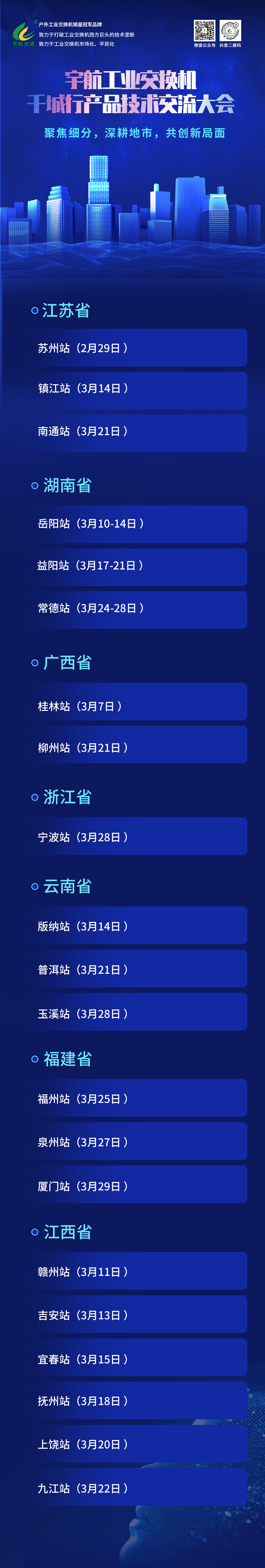 三月,宇航將攜手眾多合作伙伴和宇航全國產(chǎn)工業(yè)交換機,在濟南、西安、鄭州、合肥、武漢等地參展,與各界朋友共襄盛舉。同時,宇航還將深入江蘇、湖南、廣西、浙江、云南、福建、江西等地,舉行宇航工業(yè)交換機千城行產(chǎn)品技術(shù)交流大會,助力各行各業(yè)的數(shù)字化轉(zhuǎn)型,讓數(shù)字化轉(zhuǎn)型的春風(fēng),吹滿神州大地!