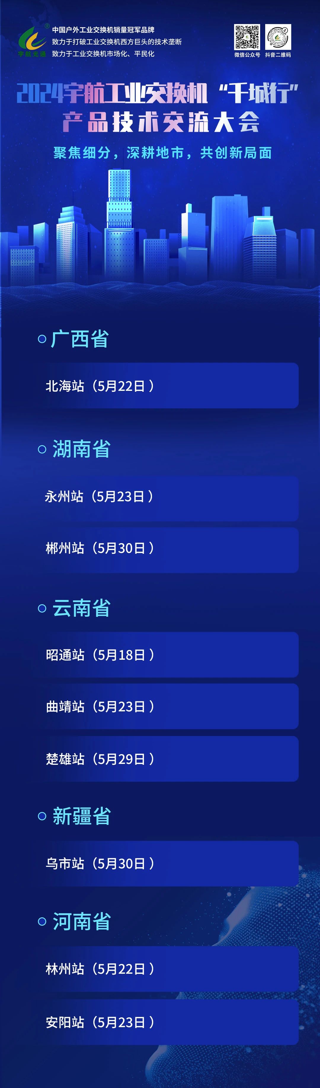 五月中下旬,宇航工業(yè)交換機繼續(xù)相約與您成都、新疆、山東、北京、湖南(永州、郴州)、廣西北海、云南(昭通、曲靖、楚雄)、河南(林州、安陽)等地市!期待您的蒞臨!