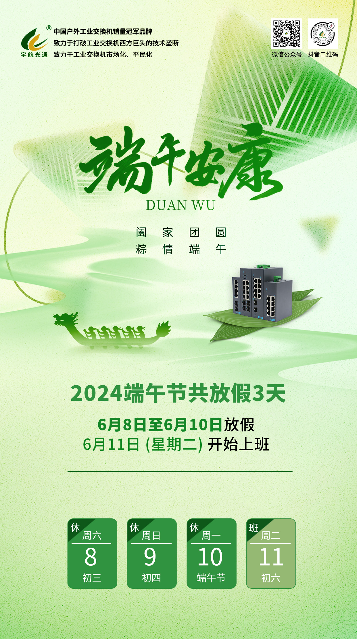 根據(jù)國(guó)家法定假期的規(guī)定,宇航工業(yè)交換機(jī)2024年端午節(jié)放假安排通知如下: