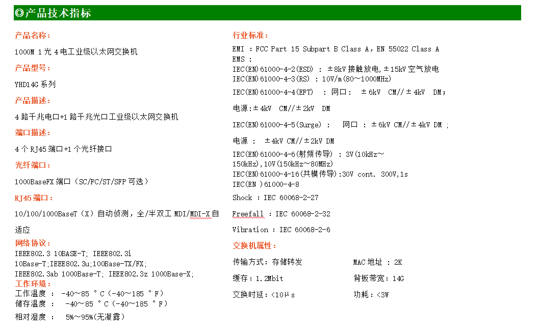 4路千兆電口+1路千兆FX光口工業級以太網交換機,支持4個100Base-T/1000Base-TX電口和1個1000Base-X光口。產品符合FCC、CE、ROHS標準。YH300-14G系列交換機具有-40℃~85℃的工作溫度,具有超強的堅固度能適應各種嚴苛環境,也可以非常方便的安置在空間緊湊的控制箱中。導軌的安裝特性、寬溫操作及擁有IP40防護等級的外殼及LED指示燈,使YH300-14G系列成為一個即插即用的工業級設備,為用戶的以太網設備聯網提供可靠、便捷的解決方案。