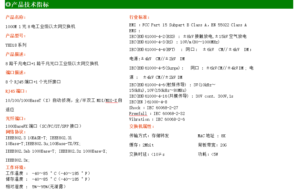 8路千兆電口+1路千兆FX光口工業級以太網交換機,支持8個100Base-T/1000Base-TX電口和1個1000Base-X光口。產品符合FCC、CE、ROHS標準。YH300-18G系列交換機具有-40℃~85℃的工作溫度,具有超強的堅固度能適應各種嚴苛環境,也可以非常方便的安置在空間緊湊的控制箱中。導軌的安裝特性、寬溫操作及擁有IP40防護等級的外殼及LED指示燈,使YH300-18G系列成為一個即插即用的工業級設備,為用戶的以太網設備聯網提供可靠、便捷的解決方案。
