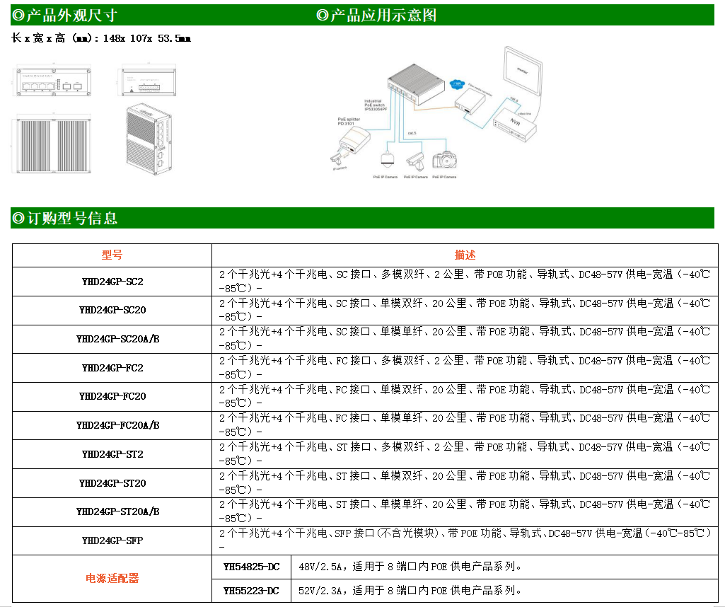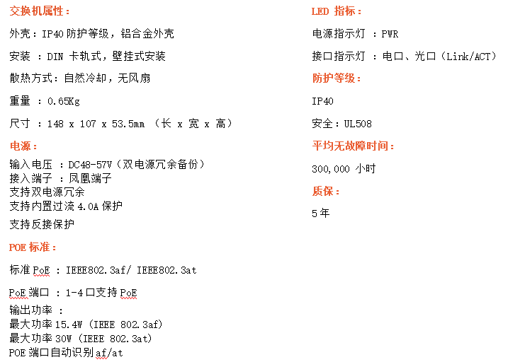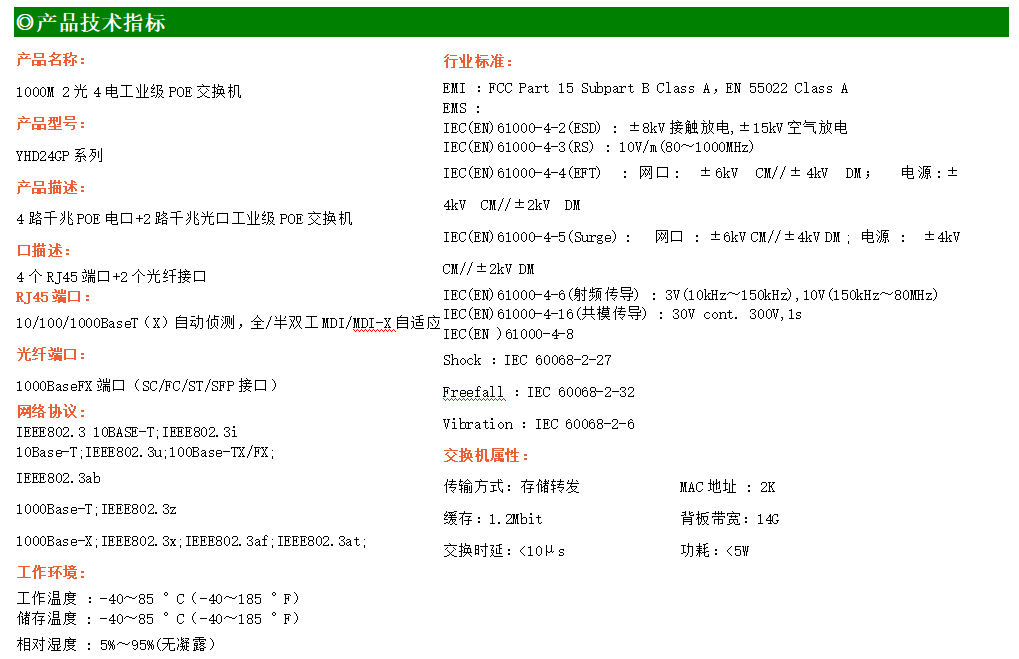 4路千兆POE電口+2路千兆FX光口工業(yè)級以太網POE交換機,支持4個10/100/1000Base-TX電口和2個1000Base-X光口。產品符合FCC、CE、ROHS標準。YHD24GP-SFP交換機具有-40℃~85℃的工作溫度,具有超強的堅固度能適應各種嚴苛環(huán)境,也可以非常方便的安置在空間緊湊的控制箱中。導軌的安裝特性、寬溫操作及擁有IP40防護等級的外殼及LED指示燈,使YH300-24GP系列成為一個即插即用的工業(yè)級設備,為用戶的以太網設備聯(lián)網提供可靠、便捷的解決方案。