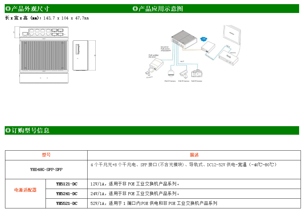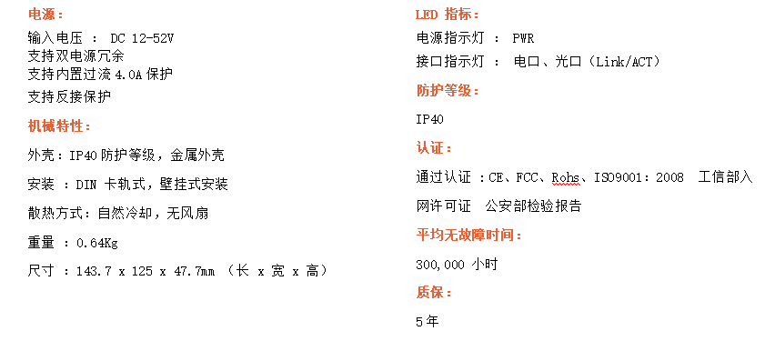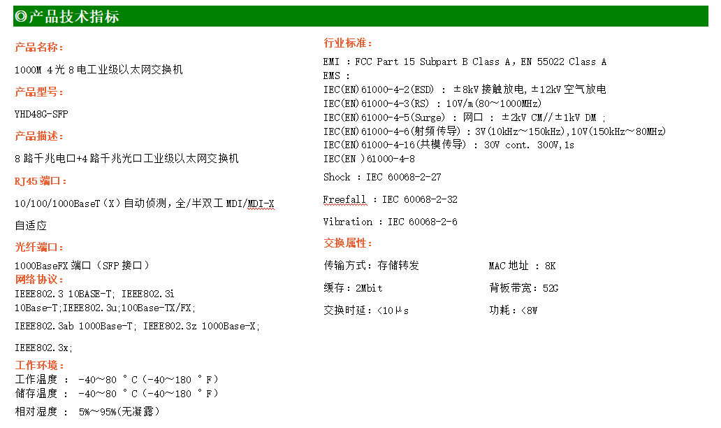 8路千兆電口+4路千兆FX光口工業級以太網交換機,支持8個100Base-T/1000Base-TX電口和4個1000Base-X光口。產品符合FCC、CE、ROHS標準。YH300-48G-SFP交換機具有-40℃~80℃的工作溫度,具有超強的堅固度能適應各種嚴苛環境,也可以非常方便的安置在空間緊湊的控制箱中。導軌的安裝特性、寬溫操作及擁有IP40防護等級的外殼及LED指示燈,使YH300-48G-SFP成為一個即插即用的工業級設備,為用戶的以太網設備聯網提供可靠、便捷的解決方案。