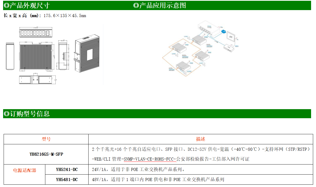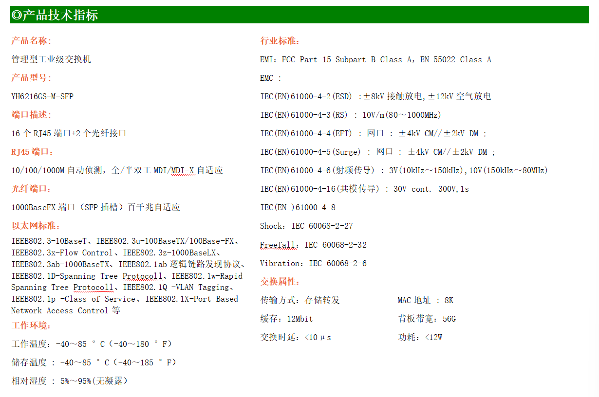 YH600-216GS-M是網管型工業(yè)以太網交換機,產品符合FCC、CE、RoHS標準。支持2個千兆光口和16個千兆電口;支持工業(yè)現場所需的以太網二層協議,保證通信網絡的穩(wěn)定性;該系列交換機采用低功耗、無風扇設計,確保無噪聲干擾,同時支持-40~80℃工作溫度和良好的EMC電磁兼容性能,保證在惡劣的工業(yè)環(huán)境中保持穩(wěn)定的工作,為工廠自動化,智能交通,視頻監(jiān)控等工業(yè)應用領域組建快速穩(wěn)定的網絡終端接入網絡提供安全可靠的解決方案。