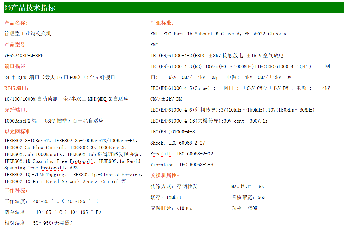 YH600-224GSP-M-SFP是網(wǎng)管型工業(yè)以太網(wǎng)交換機,產(chǎn)品符合FCC、CE、RoHS標準。支持2個千兆光口和24個千兆電口(最大16口POE);支持工業(yè)現(xiàn)場所需的以太網(wǎng)二層協(xié)議,保證通信網(wǎng)絡(luò)的穩(wěn)定性;該系列交換機采用低功耗、無風(fēng)扇設(shè)計,確保無噪聲干擾,同時支持-40~85℃工作溫度和良好的EMC電磁兼容性能,保證在惡劣的工業(yè)環(huán)境中保持穩(wěn)定的工作,為工廠自動化,智能交通,視頻監(jiān)控等工業(yè)應(yīng)用領(lǐng)域組建快速穩(wěn)定的網(wǎng)絡(luò)終端接入網(wǎng)絡(luò)提供安全可靠的解決方案。