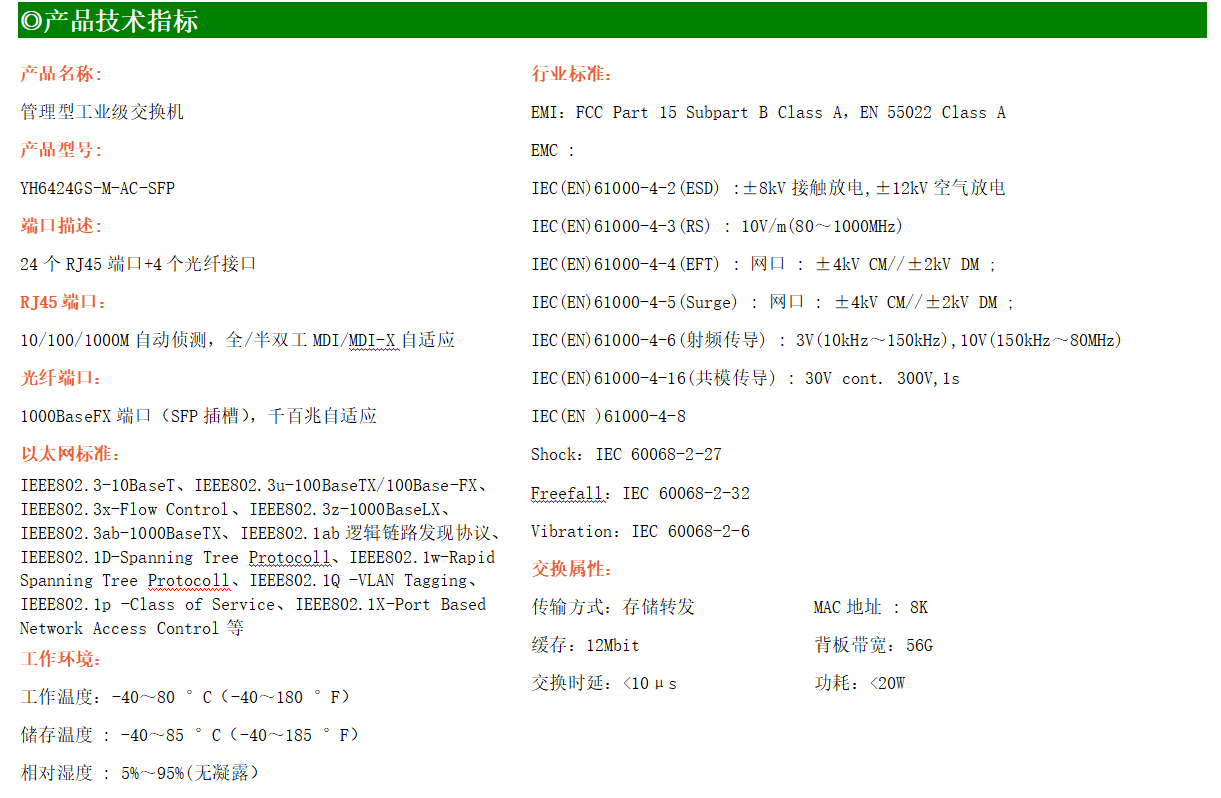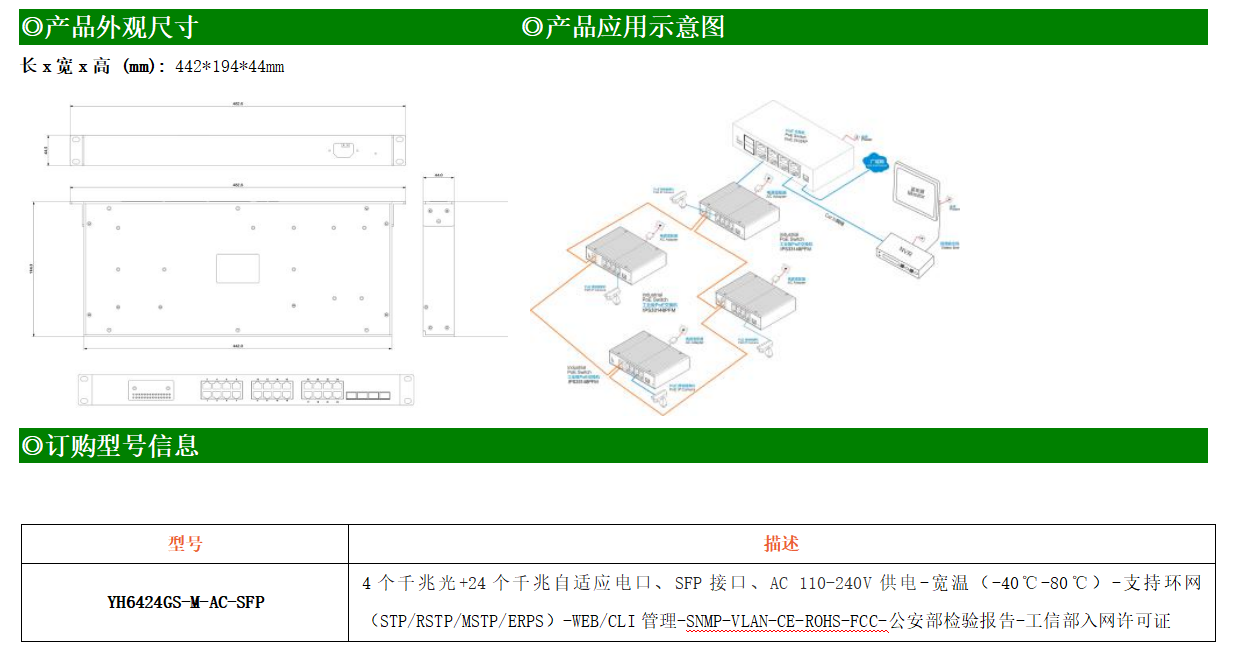 YH300-424GS-M-AC-SFP是網管型工業以太網交換機,產品符合FCC、CE、RoHS標準。支持4個千兆光口和24個千兆電口;支持工業現場所需的以太網二層協議,保證通信網絡的穩定性;該系列交換機采用低功耗、無風扇設計,確保無噪聲干擾,同時支持-40~80℃工作溫度和良好的EMC電磁兼容性能,保證在惡劣的工業環境中保持穩定的工作,為工廠自動化,智能交通,視頻監控等工業應用領域組建快速穩定的網絡終端接入網絡提供安全可靠的解決方案。