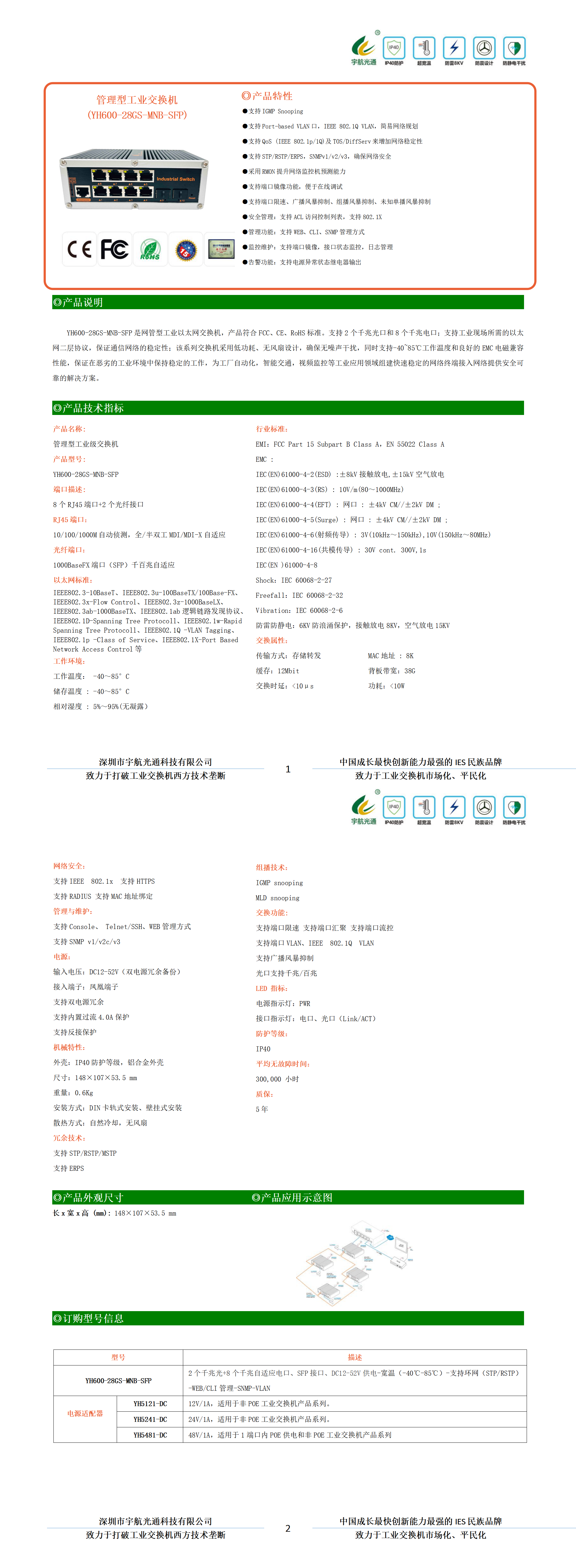 YH600-28GS-MNB-SFP是網(wǎng)管型工業(yè)以太網(wǎng)交換機,產(chǎn)品符合FCC、CE、RoHS標準。支持2個千兆光口和8個千兆電口;支持工業(yè)現(xiàn)場所需的以太網(wǎng)二層協(xié)議,保證通信網(wǎng)絡(luò)的穩(wěn)定性;該系列交換機采用低功耗、無風(fēng)扇設(shè)計,確保無噪聲干擾,同時支持-40~85℃工作溫度和良好的EMC電磁兼容性能,保證在惡劣的工業(yè)環(huán)境中保持穩(wěn)定的工作,為工廠自動化,智能交通,視頻監(jiān)控等工業(yè)應(yīng)用領(lǐng)域組建快速穩(wěn)定的網(wǎng)絡(luò)終端接入網(wǎng)絡(luò)提供安全可靠的解決方案。