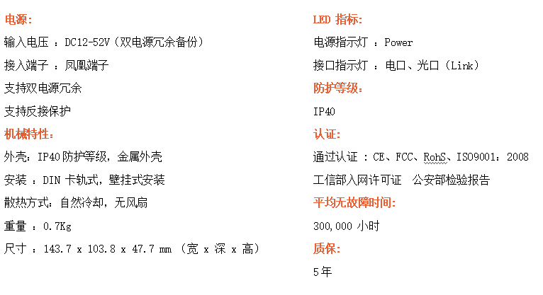 4路百兆電口+4路百兆光口工業級以太網交換機,支持4個10Base-T/100Base-TX電口和4個100Base-FX(SC/FC/ST可選)光口。產品符合FCC、CE、ROHS標準。RD44F交換機具有-40℃~80℃的工作溫度,具有超強的堅固度能適應各種嚴苛環境,也可以非常方便的安置在空間緊湊的控制箱中。導軌的安裝特性、寬溫操作及擁有IP40防護等級的外殼及LED指示燈,使RD44F成為一個即插即用的工業級設備,為用戶的以太網設備聯網提供可靠、便捷的解決方案。
