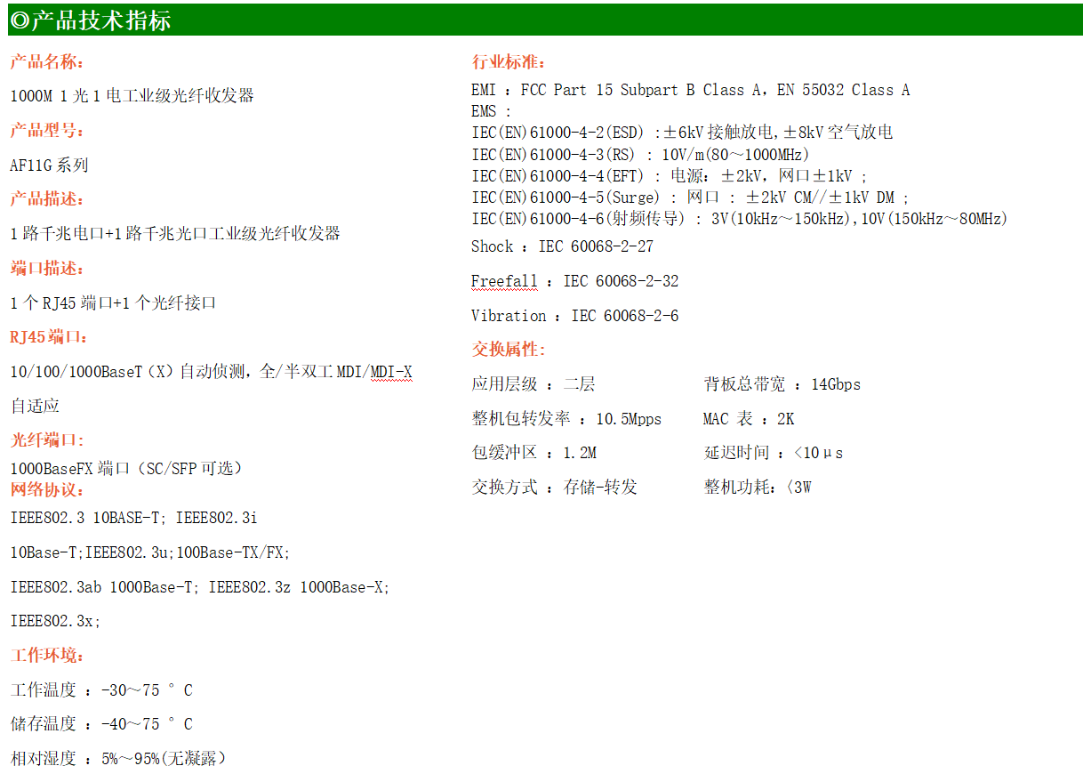 1路千兆電口+1路千兆FX光口工業(yè)級以太網(wǎng)交換機,支持1個10Base-T/100Base-T/1000Base-TX電口和1個1000Base-X光口。產(chǎn)品符合FCC、CE、ROHS標(biāo)準(zhǔn)。AF11G系列交換機具有-30℃~75℃的工作溫度,具有超強的堅固度能適應(yīng)各種嚴(yán)苛環(huán)境,也可以非常方便的安置在空間緊湊的控制箱中。導(dǎo)軌的安裝特性、寬溫操作及擁有IP40防護等級的外殼及LED指示燈,使AF11G成為一個即插即用的工業(yè)級設(shè)備,為用戶的以太網(wǎng)設(shè)備聯(lián)網(wǎng)提供可靠、便捷的解決方案。