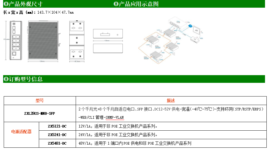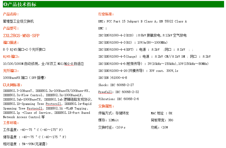 ZXL28GS-MNB-SFP是網管型工業以太網交換機,產品符合FCC、CE、RoHS標準。支持2個千兆光口和8個千兆電口;支持工業現場所需的以太網二層協議,保證通信網絡的穩定性;該系列交換機采用低功耗、無風扇設計,確保無噪聲干擾,同時支持-40~75℃工作溫度和良好的EMC電磁兼容性能,保證在惡劣的工業環境中保持穩定的工作,為工廠自動化,智能交通,視頻監控等工業應用領域組建快速穩定的網絡終端接入網絡提供安全可靠的解決方案。