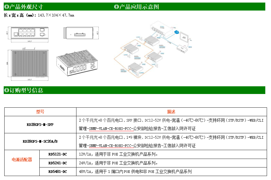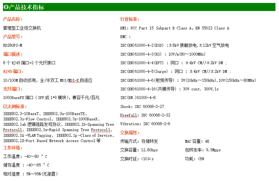 RD28GFS-M-SFP是網管型工業以太網交換機,產品符合FCC、CE、RoHS標準。支持2個千兆光口和8個百兆電口;支持工業現場所需的以太網二層協議,保證通信網絡的穩定性;該系列交換機采用低功耗、無風扇設計,確保無噪聲干擾,同時支持-40~80℃工作溫度和良好的EMC電磁兼容性能,保證在惡劣的工業環境中保持穩定的工作,為工廠自動化,智能交通,視頻監控等工業應用領域組建快速穩定的網絡終端接入網絡提供安全可靠的解決方案。
