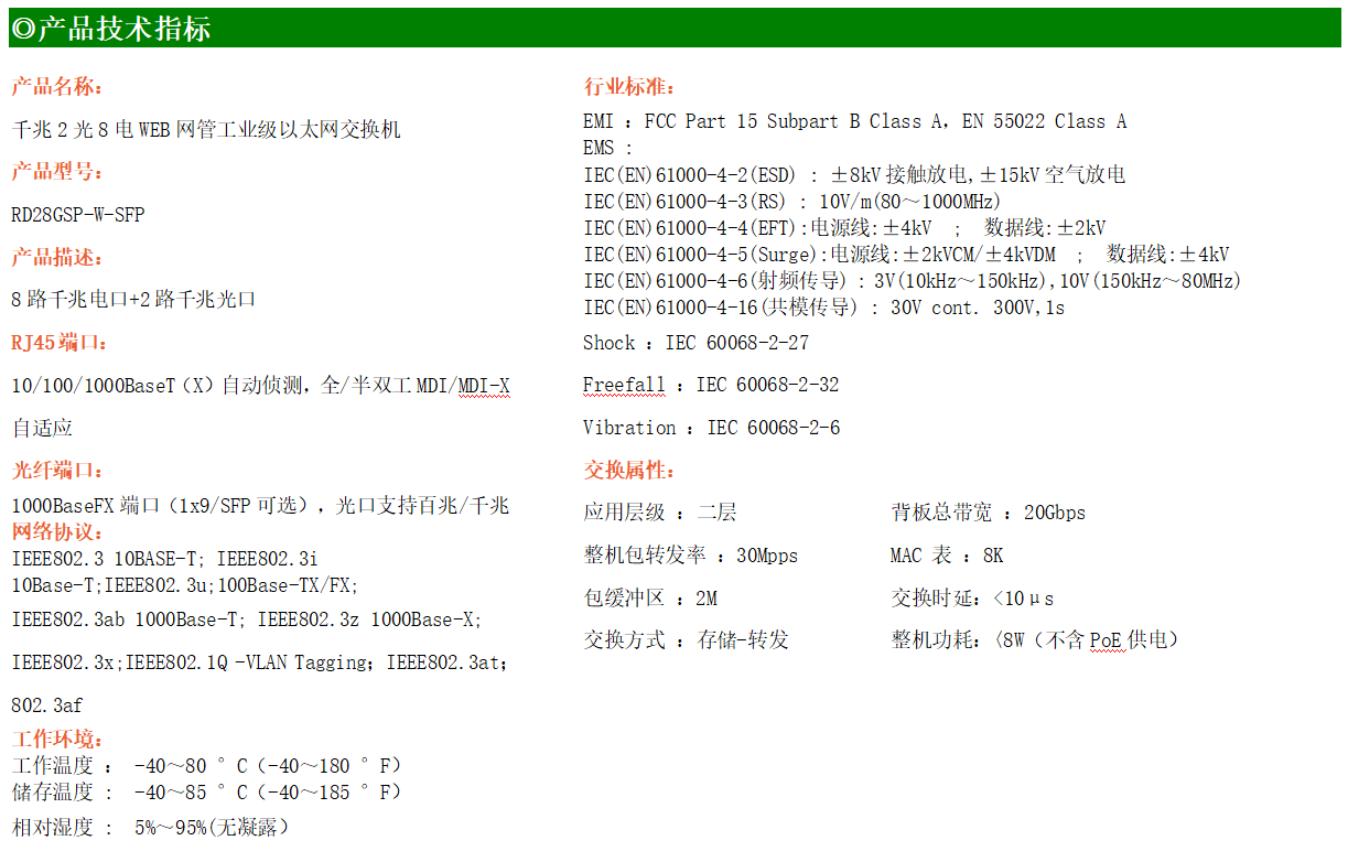 RD28GSP-W-SFP系列WEB管理工業(yè)級以太網(wǎng)PoE交換機,產品符合FCC、CE、ROHS標準,支持工業(yè)現(xiàn)場所需的以太網(wǎng)二層協(xié)議,保證通信網(wǎng)絡的穩(wěn)定性。該系列交換機采用低功耗、無風扇設計,確保無噪聲干擾,同時支持-40~80℃工作溫度和良好的EMC電磁兼容性能,保證在惡劣的工業(yè)環(huán)境中保持穩(wěn)定的工作,為工廠自動化,智能交通,視頻監(jiān)控等工業(yè)應用領域組建快速穩(wěn)定的網(wǎng)絡終端接入網(wǎng)絡提供安全可靠的解決方案。