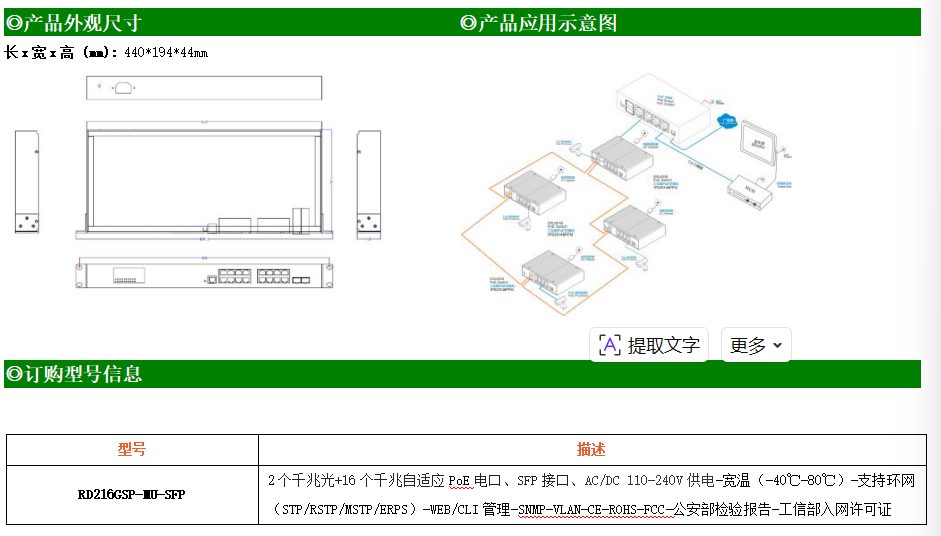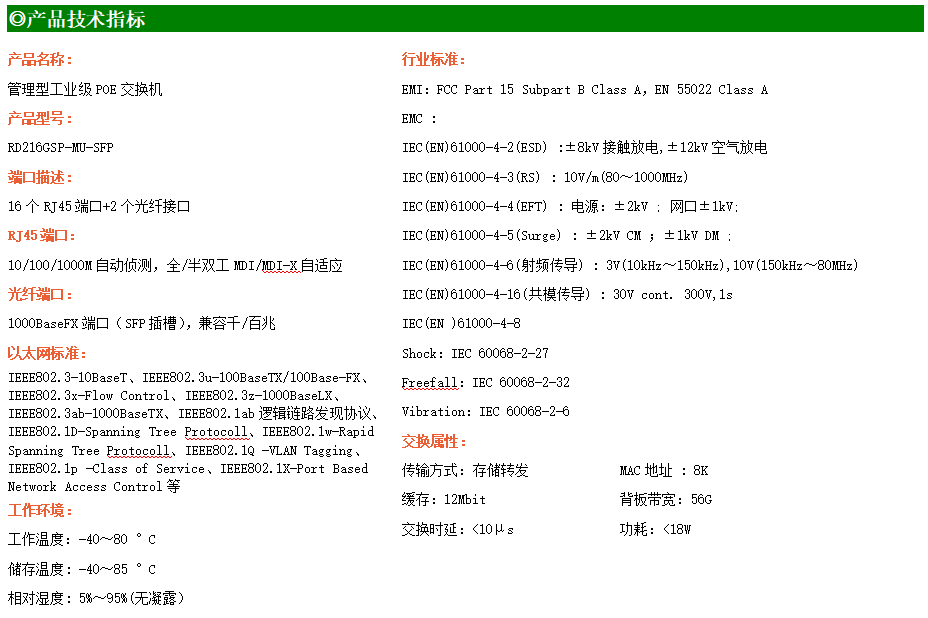 RD216GSP-MU-SFP是網(wǎng)管型工業(yè)以太網(wǎng)POE交換機(jī),產(chǎn)品符合FCC、CE、RoHS標(biāo)準(zhǔn)。支持2個(gè)千兆光口和16個(gè)千兆POE電口,所有PoE端口符合IEEE802.3af/at標(biāo)準(zhǔn)。支持工業(yè)現(xiàn)場(chǎng)所需的以太網(wǎng)二層協(xié)議,保證通信網(wǎng)絡(luò)的穩(wěn)定性;該系列交換機(jī)采用低功耗、無(wú)風(fēng)扇設(shè)計(jì),確保無(wú)噪聲干擾,同時(shí)支持-40~80℃工作溫度和良好的EMC電磁兼容性能,保證在惡劣的工業(yè)環(huán)境中保持穩(wěn)定的工作,為工廠自動(dòng)化,智能交通,視頻監(jiān)控等工業(yè)應(yīng)用領(lǐng)域組建快速穩(wěn)定的網(wǎng)絡(luò)終端接入網(wǎng)絡(luò)提供安全可靠的解決方案。