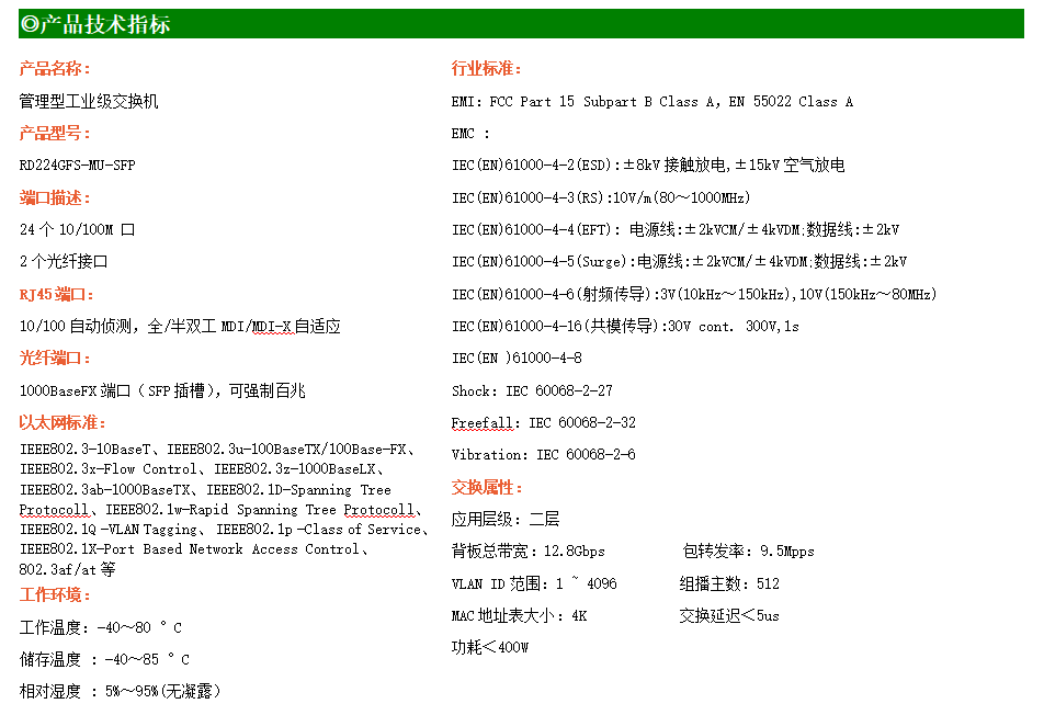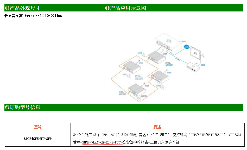 RD224GFSP-MU-AC-SFP是網(wǎng)管型工業(yè)以太網(wǎng)PoE交換機(jī),產(chǎn)品符合FCC、CE、RoHS標(biāo)準(zhǔn)。可提供24個(gè)百兆PoE端口,所有PoE端口符合IEEE802.3af/at標(biāo)準(zhǔn)。支持工業(yè)現(xiàn)場(chǎng)所需的以太網(wǎng)二層協(xié)議,保證通信網(wǎng)絡(luò)的穩(wěn)定性;該系列交換機(jī)采用低功耗、無(wú)風(fēng)扇設(shè)計(jì),確保無(wú)噪聲干擾,同時(shí)支持-40~85℃工作溫度和良好的EMC電磁兼容性能,保證在惡劣的工業(yè)環(huán)境中保持穩(wěn)定的工作,為工廠自動(dòng)化,智能交通,視頻監(jiān)控等工業(yè)應(yīng)用領(lǐng)域組建快速穩(wěn)定的網(wǎng)絡(luò)終端接入網(wǎng)絡(luò)提供安全可靠的解決方案。