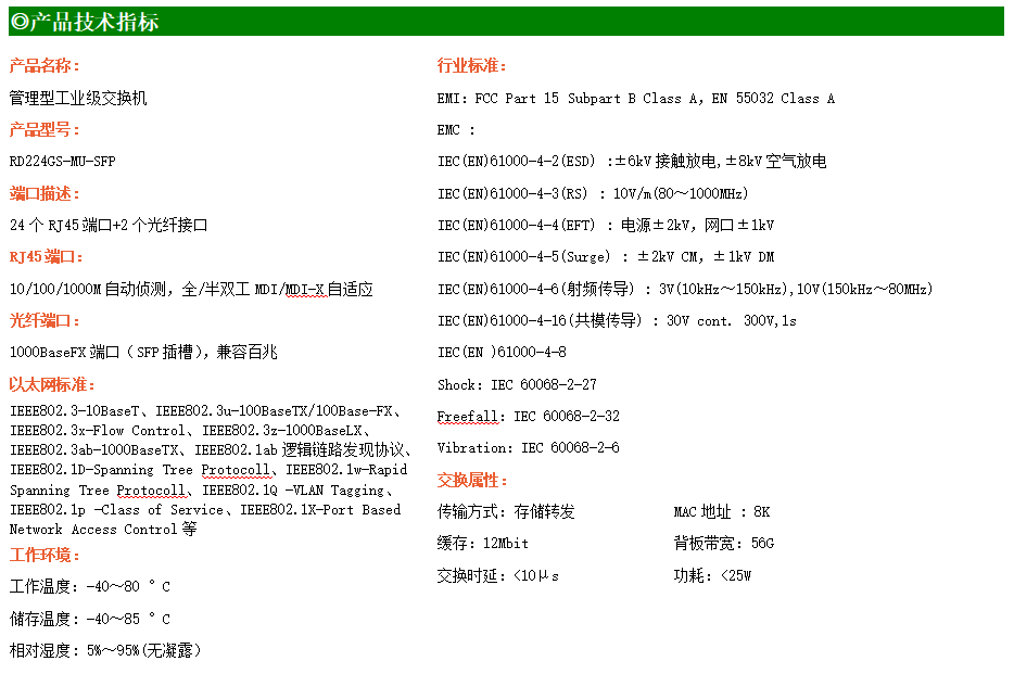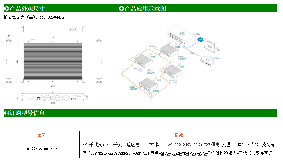 RD224GSP-MU-SFP是網(wǎng)管型工業(yè)以太網(wǎng)PoE交換機(jī),產(chǎn)品符合FCC、CE、RoHS標(biāo)準(zhǔn)。可提供24個(gè)千兆PoE端口,所有PoE端口符合IEEE802.3af/at標(biāo)準(zhǔn)。支持工業(yè)現(xiàn)場(chǎng)所需的以太網(wǎng)二層協(xié)議,保證通信網(wǎng)絡(luò)的穩(wěn)定性;該系列交換機(jī)采用低功耗、無(wú)風(fēng)扇設(shè)計(jì),確保無(wú)噪聲干擾,同時(shí)支持-40~70℃工作溫度和良好的EMC電磁兼容性能,保證在惡劣的工業(yè)環(huán)境中保持穩(wěn)定的工作,為工廠自動(dòng)化,智能交通,視頻監(jiān)控等工業(yè)應(yīng)用領(lǐng)域組建快速穩(wěn)定的網(wǎng)絡(luò)終端接入網(wǎng)絡(luò)提供安全可靠的解決方案