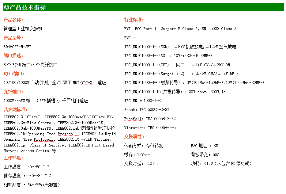 RD48GSP-M是網管型工業級以太網PoE交換機,提供4個千兆光口和8個千兆電口支持8路PoE,支持工業現場所需的以太網二層協議,保證通信網絡的穩定性;該系列交換機采用低功耗、無風扇設計,確保無噪聲干擾,同時支持-40~80℃工作溫度和良好的EMC電磁兼容性能,保證在惡劣的工業環境中保持穩定的工作,為工廠自動化,智能交通,視頻監控等工業應用領域組建快速穩定的網絡終端接入網絡提供安全可靠的解決方案。