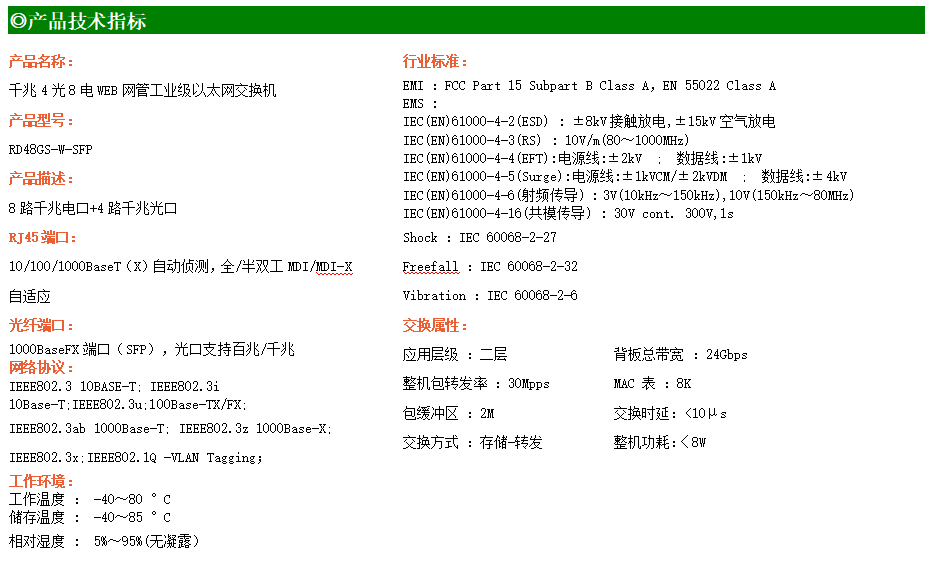 RD48GS-W-SFP系列WEB網管工業級以太網交換機,產品符合FCC、CE、ROHS標準,支持工業現場所需的以太網二層協議,保證通信網絡的穩定性。該系列交換機采用低功耗、無風扇設計,確保無噪聲干擾,同時支持-40~80℃工作溫度和良好的EMC電磁兼容性能,保證在惡劣的工業環境中保持穩定的工作,為工廠自動化,智能交通,視頻監控等工業應用領域組建快速穩定的網絡終端接入網絡提供安全可靠的解決方案。