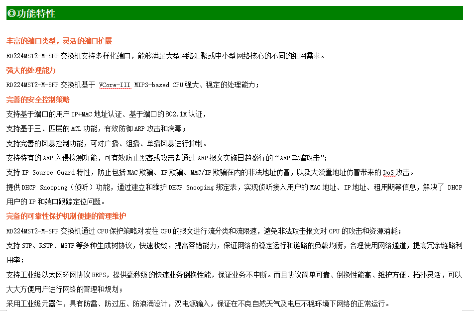 ●網絡冗余:支持STP/RSTP/MSTP,支持ERPS(自愈時間<20ms)