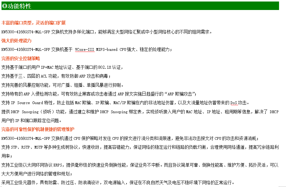 KW5300-4168GST4-MQL-SFP交換機是我司推出的一款萬兆三層交換機,配備4個萬兆SFP+光口、16個千兆SFP光口和8個10/100/1000M Base-T自適應電口,具備先進的硬件處理能力和最豐富的業務特性。支持IPv4/IPv6 硬件雙棧及線速轉發,使客戶能夠從容應對即將帶來的IPv6 時代其提供高容量的交換能力。KW5300-4168GST4-MQL-SFP交換機具有-30℃-70℃的工作溫度,具有超強的堅固度能適應各種嚴苛環境。導軌式安裝特性、寬溫操作,使KW5300-4168GST4-MQL-SFP的交換機成為一個即插即用的工業級設備,為用戶的以太網設備聯網提供可靠、便捷的解決方案。