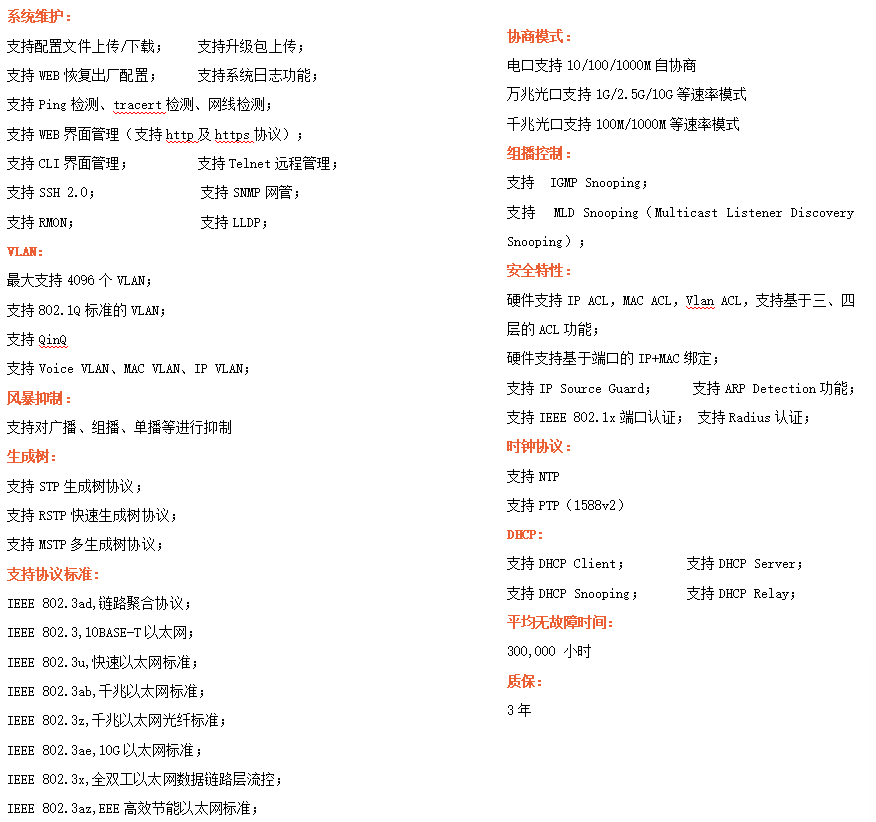 ●網(wǎng)絡(luò)冗余:支持STP/RSTP/MSTP,支持ERPS(自愈時間<20ms)