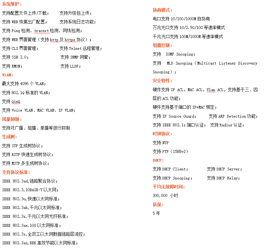●網絡冗余:支持STP/RSTP/MSTP,支持ERPS(自愈時間<20ms)