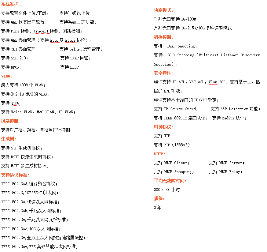 ●網(wǎng)絡(luò)冗余:支持STP/RSTP/MSTP,支持ERPS(自愈時(shí)間<20ms)