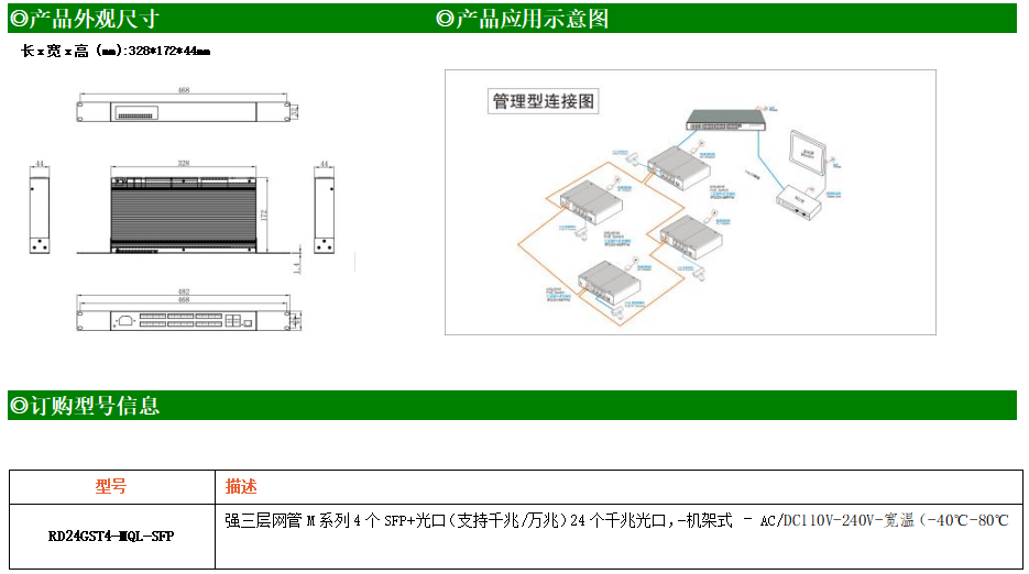 RD24GST4-MQL-SFP交換機(jī)是我司推出的一款萬(wàn)兆三層交換機(jī),配備4個(gè)萬(wàn)兆SFP+光口和24個(gè)千兆光口,具備先進(jìn)的硬件處理能力和最豐富的業(yè)務(wù)特性。支持IPv4/IPv6 硬件雙棧及線速轉(zhuǎn)發(fā),使客戶能夠從容應(yīng)對(duì)即將帶來(lái)的IPv6 時(shí)代其提供高容量的交換能力。RD24GST4-MQL-SFP交換機(jī)具有-40℃~80℃的工作溫度,具有超強(qiáng)的堅(jiān)固度能適應(yīng)各種嚴(yán)苛環(huán)境。導(dǎo)軌式安裝特性、寬溫操作,使RD24GST4-MQL-SFP的交換機(jī)成為一個(gè)即插即用的工業(yè)級(jí)設(shè)備,為用戶的以太網(wǎng)設(shè)備聯(lián)網(wǎng)提供可靠、便捷的解決方案。