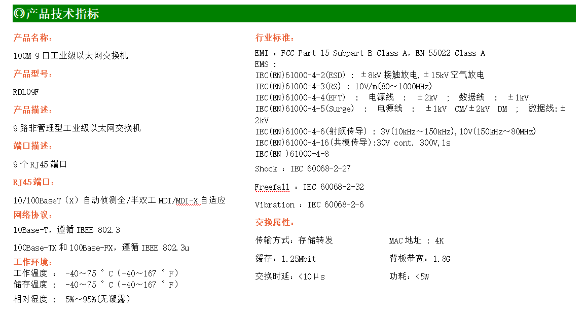 9路百兆電口工業級以太網交換機,支持9個10Base-T/100Base-TX電口。產品符合FCC、CE、ROHS標準。RDL09F交換機具有-40℃~75℃的工作溫度,具有超強的堅固度能適應各種嚴苛環境,也可以非常方便的安置在空間緊湊的控制箱中。導軌的安裝特性、寬溫操作及擁有IP40防護等級的外殼及LED指示燈,使RDL09F成為一個即插即用的工業級設備,為用戶的以太網設備聯網提供可靠、便捷的解決方案。