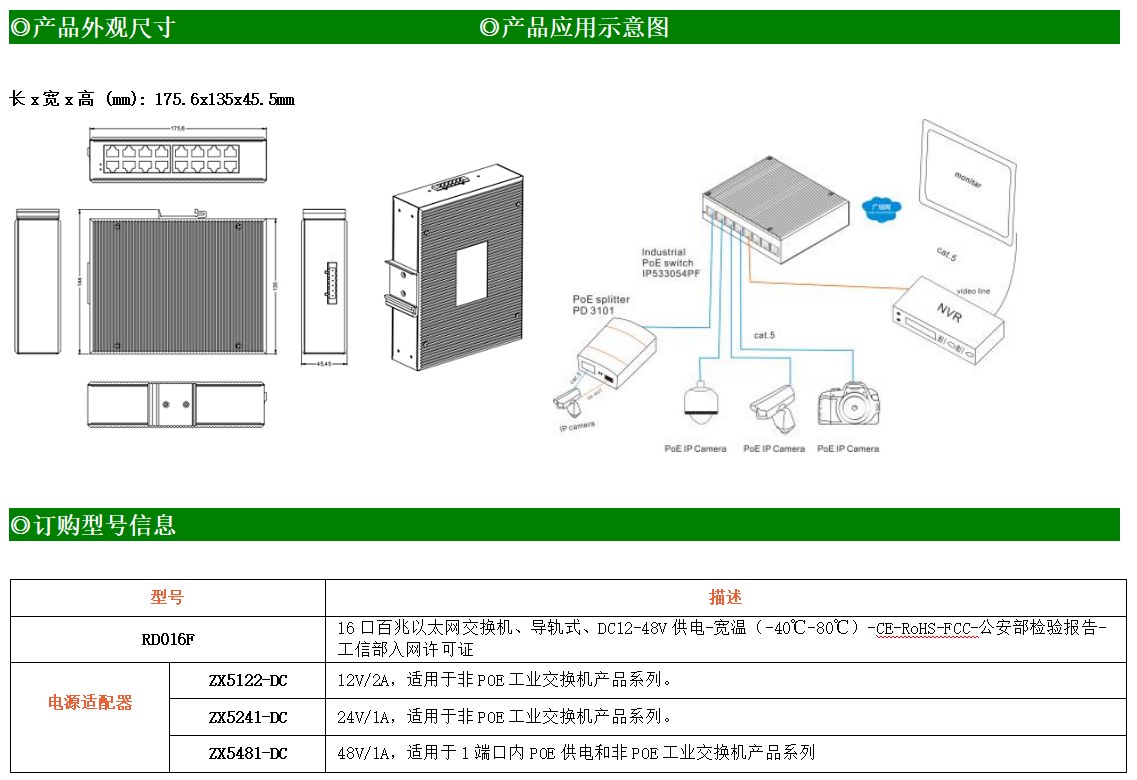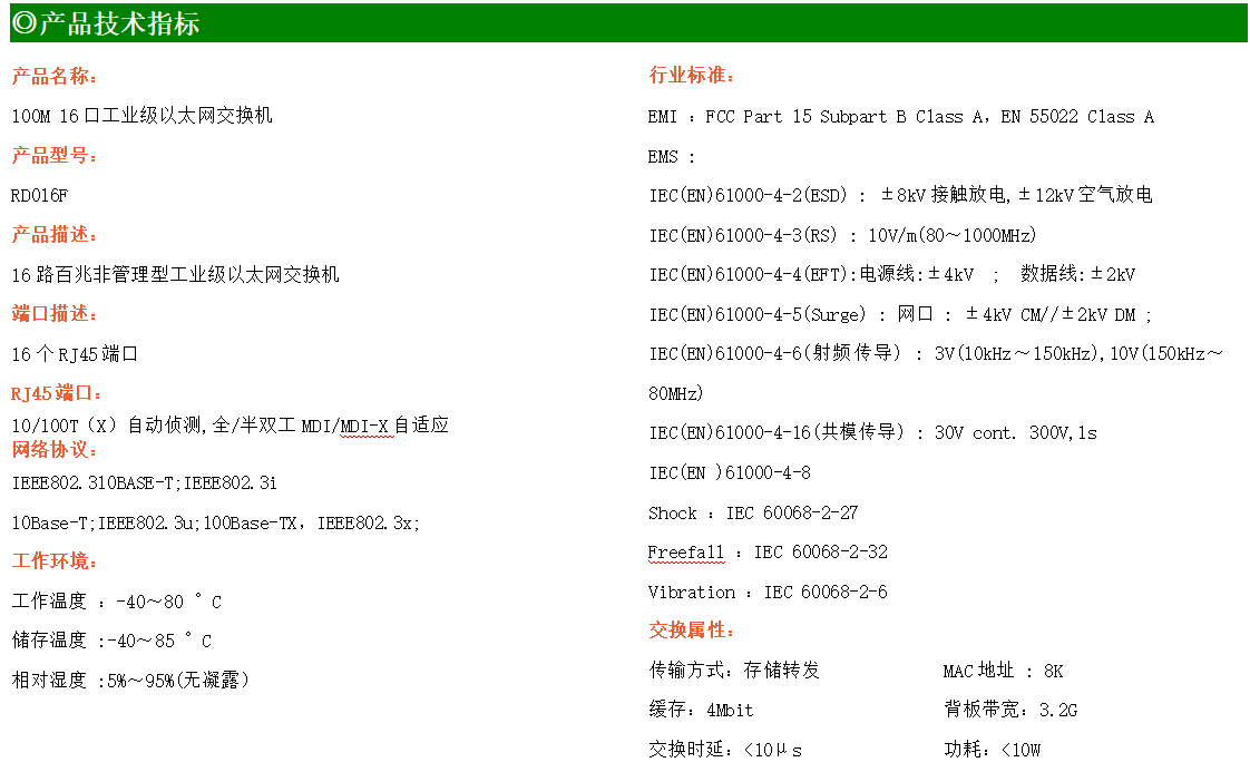 16路百兆電口工業級以太網交換機,支持16個10Base-T/100Base-TX電口。產品符合FCC、CE、ROHS標準。RD016F交換機具有-40℃~80℃的工作溫度,具有超強的堅固度能適應各種嚴苛環境,也可以非常方便的安置在空間緊湊的控制箱中。導軌的安裝特性、寬溫操作及擁有IP40防護等級的外殼及LED指示燈,使RD016F成為一個即插即用的工業級設備,為用戶的以太網設備聯網提供可靠、便捷的解決方案。