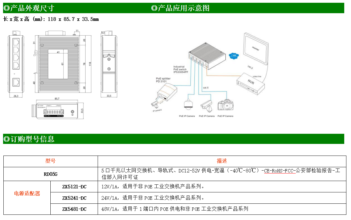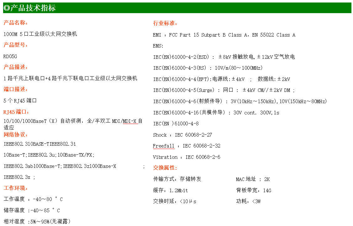 1路千兆上聯電口+4路千兆下聯電口工業級以太網交換機,支持1個10/100/1000Base-TX上聯電口和4個10/100/1000Base-TX下聯電口。產品符合FCC、CE、ROHS標準。RD05G交換機具有-40℃~80℃的工作溫度,具有超強的堅固度能適應各種嚴苛環境,也可以非常方便的安置在空間緊湊的控制箱中。導軌的安裝特性、寬溫操作及擁有IP40防護等級的外殼及LED指示燈,使RD05G成為一個即插即用的工業級設備,為用戶的以太網設備聯網提供可靠、便捷的解決方案。