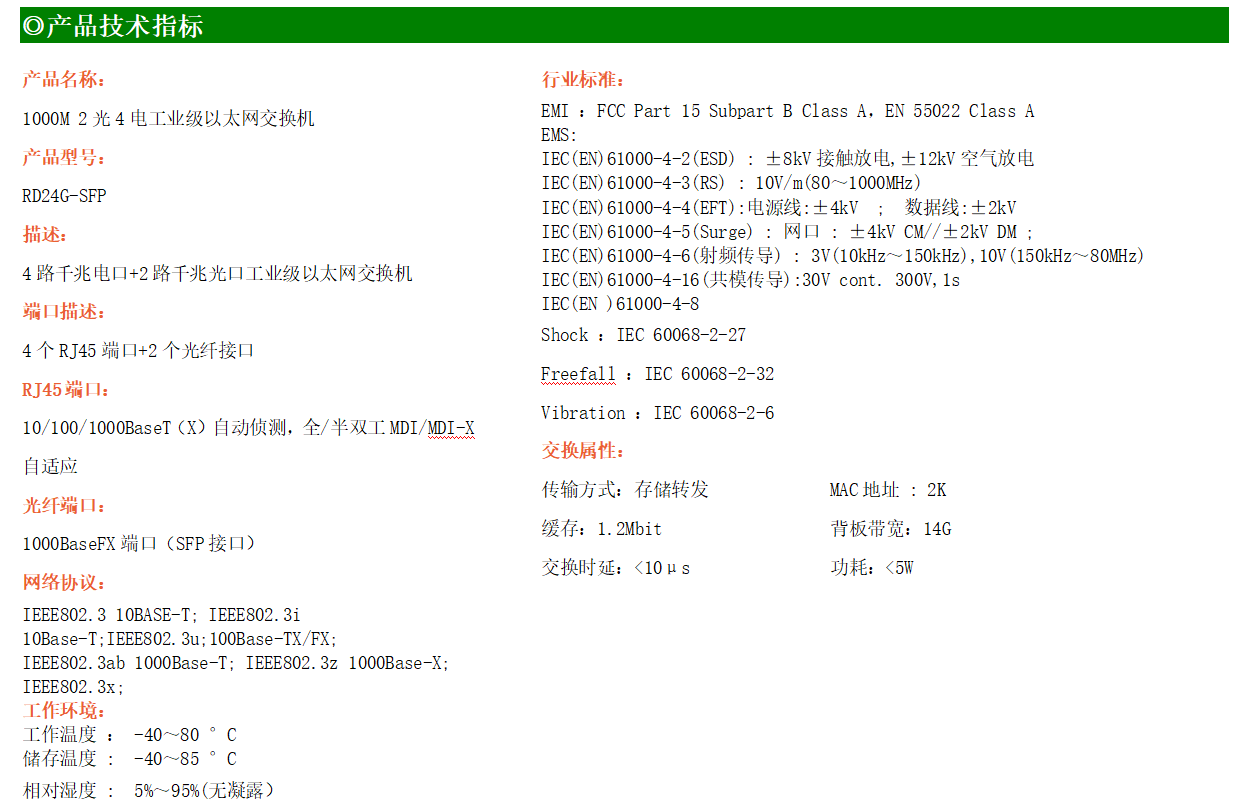 4路千兆電口+2路千兆FX光口工業(yè)級(jí)以太網(wǎng)交換機(jī),支持4個(gè)100Base-T/1000Base-TX電口和2個(gè)1000Base-X光口。產(chǎn)品符合FCC、CE、ROHS標(biāo)準(zhǔn)。RD24G交換機(jī)具有-40℃~80℃的工作溫度,具有超強(qiáng)的堅(jiān)固度能適應(yīng)各種嚴(yán)苛環(huán)境,也可以非常方便的安置在空間緊湊的控制箱中。導(dǎo)軌的安裝特性、寬溫操作及擁有IP40防護(hù)等級(jí)的外殼及LED指示燈,使RD24G成為一個(gè)即插即用的工業(yè)級(jí)設(shè)備,為用戶的以太網(wǎng)設(shè)備聯(lián)網(wǎng)提供可靠、便捷的解決方案。