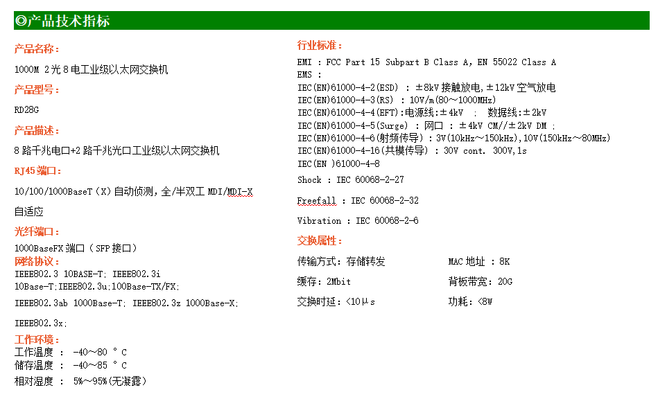 8路千兆電口+2路千兆FX光口工業(yè)級(jí)以太網(wǎng)交換機(jī),支持8個(gè)100Base-T/1000Base-TX電口和2個(gè)1000Base-X光口。產(chǎn)品符合FCC、CE、ROHS標(biāo)準(zhǔn)。RD28G交換機(jī)具有-40℃~80℃的工作溫度,具有超強(qiáng)的堅(jiān)固度能適應(yīng)各種嚴(yán)苛環(huán)境,也可以非常方便的安置在空間緊湊的控制箱中。導(dǎo)軌的安裝特性、寬溫操作及擁有IP40防護(hù)等級(jí)的外殼及LED指示燈,使RD28G成為一個(gè)即插即用的工業(yè)級(jí)設(shè)備,為用戶的以太網(wǎng)設(shè)備聯(lián)網(wǎng)提供可靠、便捷的解決方案。