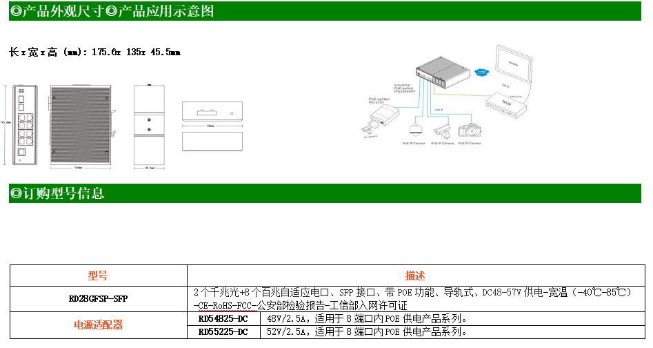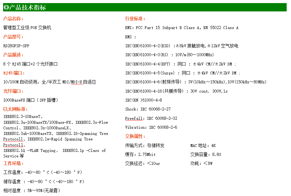 RD28GFSP-SFP是網(wǎng)管型工業(yè)以太網(wǎng)POE交換機(jī),產(chǎn)品符合FCC、CE、ROHS標(biāo)準(zhǔn)。支持2個(gè)千兆光口和8個(gè)百兆電口,支持一路console口;支持工業(yè)現(xiàn)場(chǎng)所需的以太網(wǎng)二層協(xié)議,保證通信網(wǎng)絡(luò)的穩(wěn)定性;該系列交換機(jī)采用低功耗、無(wú)風(fēng)扇設(shè)計(jì),確保無(wú)噪聲干擾,同時(shí)支持-40~85℃工作溫度和良好的EMC電磁兼容性能,保證在惡劣的工業(yè)環(huán)境中保持穩(wěn)定的工作,為工廠(chǎng)自動(dòng)化,智能交通,視頻監(jiān)控等工業(yè)應(yīng)用領(lǐng)域組建快速穩(wěn)定的網(wǎng)絡(luò)終端接入網(wǎng)絡(luò)提供安全可靠的解決方案。