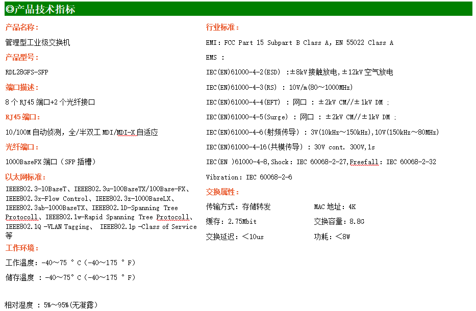 RDL28GFS-SFP是網管型工業以太網交換機,產品符合FCC、CE、ROHS標準。支持2個千兆光口和8個百兆電口,支持一路console口;支持工業現場所需的以太網二層協議,保證通信網絡的穩定性;該系列交換機采用低功耗、無風扇設計,確保無噪聲干擾,同時支持-40~75℃工作溫度和良好的EMC電磁兼容性能,保證在惡劣的工業環境中保持穩定的工作,為工廠自動化,智能交通,視頻監控等工業應用領域組建快速穩定的網絡終端接入網絡提供安全可靠的解決方案。