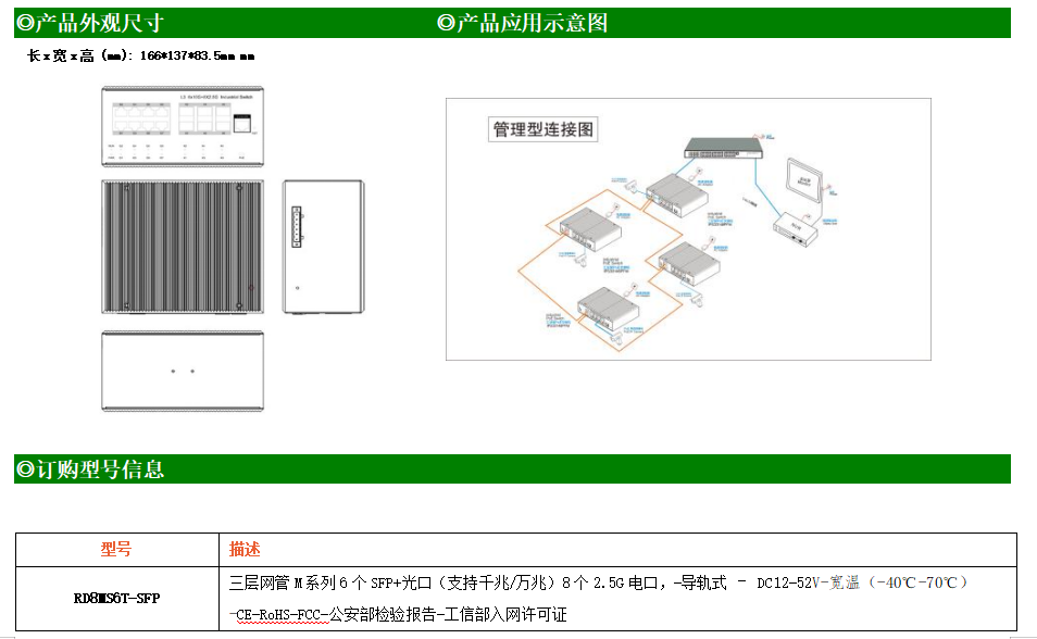 RD8MS6T-SFP交換機是我司推出的一款萬兆三層工業以太網交換機,產品符合FCC、CE、RoHS標準。可提供8個2.5G 端口。具備先進的硬件處理能力和最豐富的業務特性。支持IPv4/IPv6 硬件雙棧及線速轉發,使客戶能夠從容應對即將帶來的IPv6 時代其提供高容量的交換能力。RD8MS6T-SFP交換機具有-40℃~70℃的工作溫度,具有超強的堅固度能適應各種嚴苛環境。導軌式安裝特性、寬溫操作,使RD8MS6T-SFP的交換機成為一個即插即用的工業級設備,為用戶的以太網設備聯網提供可靠、便捷的解決方案。