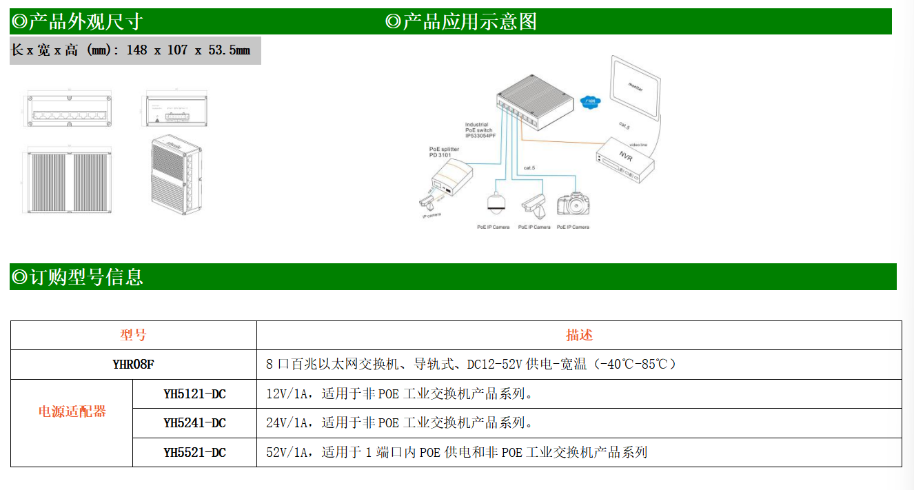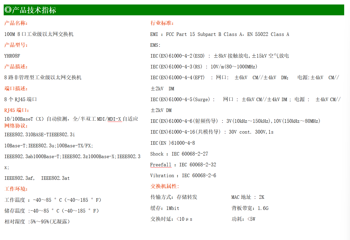 8路百兆電口工業(yè)級(jí)以太網(wǎng)交換機(jī),支持8個(gè)10Base-T/100Base-TX電口。產(chǎn)品符合FCC、CE、ROHS標(biāo)準(zhǔn)。YH200-08F交換機(jī)具有-40℃~85℃的工作溫度,具有超強(qiáng)的堅(jiān)固度能適應(yīng)各種嚴(yán)苛環(huán)境,也可以非常方便的安置在空間緊湊的控制箱中。導(dǎo)軌的安裝特性、寬溫操作及擁有IP40防護(hù)等級(jí)的外殼及LED指示燈,使YHR08F成為一個(gè)即插即用的工業(yè)級(jí)設(shè)備,為用戶的以太網(wǎng)設(shè)備聯(lián)網(wǎng)提供可靠、便捷的解決方案。
