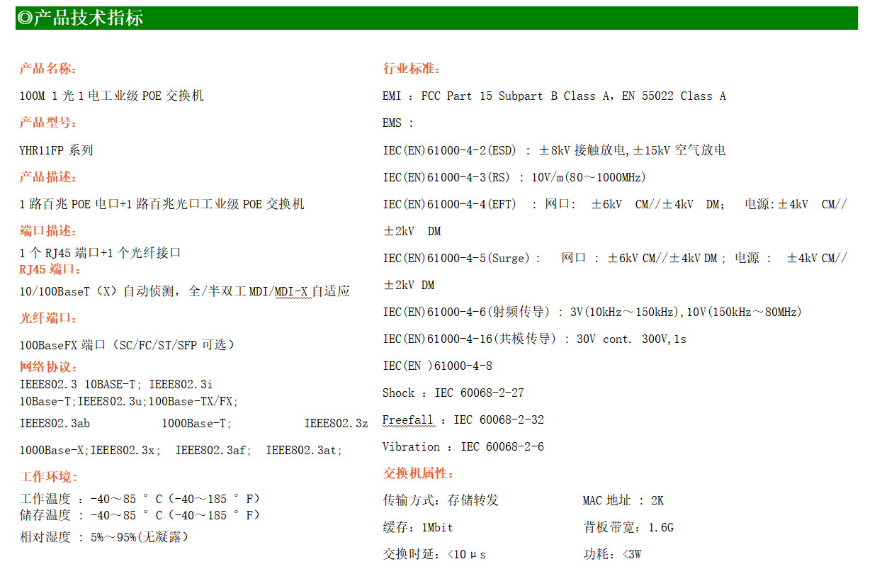 1路百兆POE電口+1路百兆FX光口工業(yè)級(jí)以太網(wǎng)POE交換機(jī),支持1個(gè)10/100Base-TX電口和1個(gè)100Base-X光口。產(chǎn)品符合FCC、CE、ROHS標(biāo)準(zhǔn)。YH200-11FP系列交換機(jī)具有-40℃~85℃的工作溫度,具有超強(qiáng)的堅(jiān)固度能適應(yīng)各種嚴(yán)苛環(huán)境,也可以非常方便的安置在空間緊湊的控制箱中。導(dǎo)軌的安裝特性、寬溫操作及擁有IP40防護(hù)等級(jí)的外殼及LED指示燈,使YH200-11FP成為一個(gè)即插即用的工業(yè)級(jí)設(shè)備,為用戶的以太網(wǎng)設(shè)備聯(lián)網(wǎng)提供可靠、便捷的解決方案。