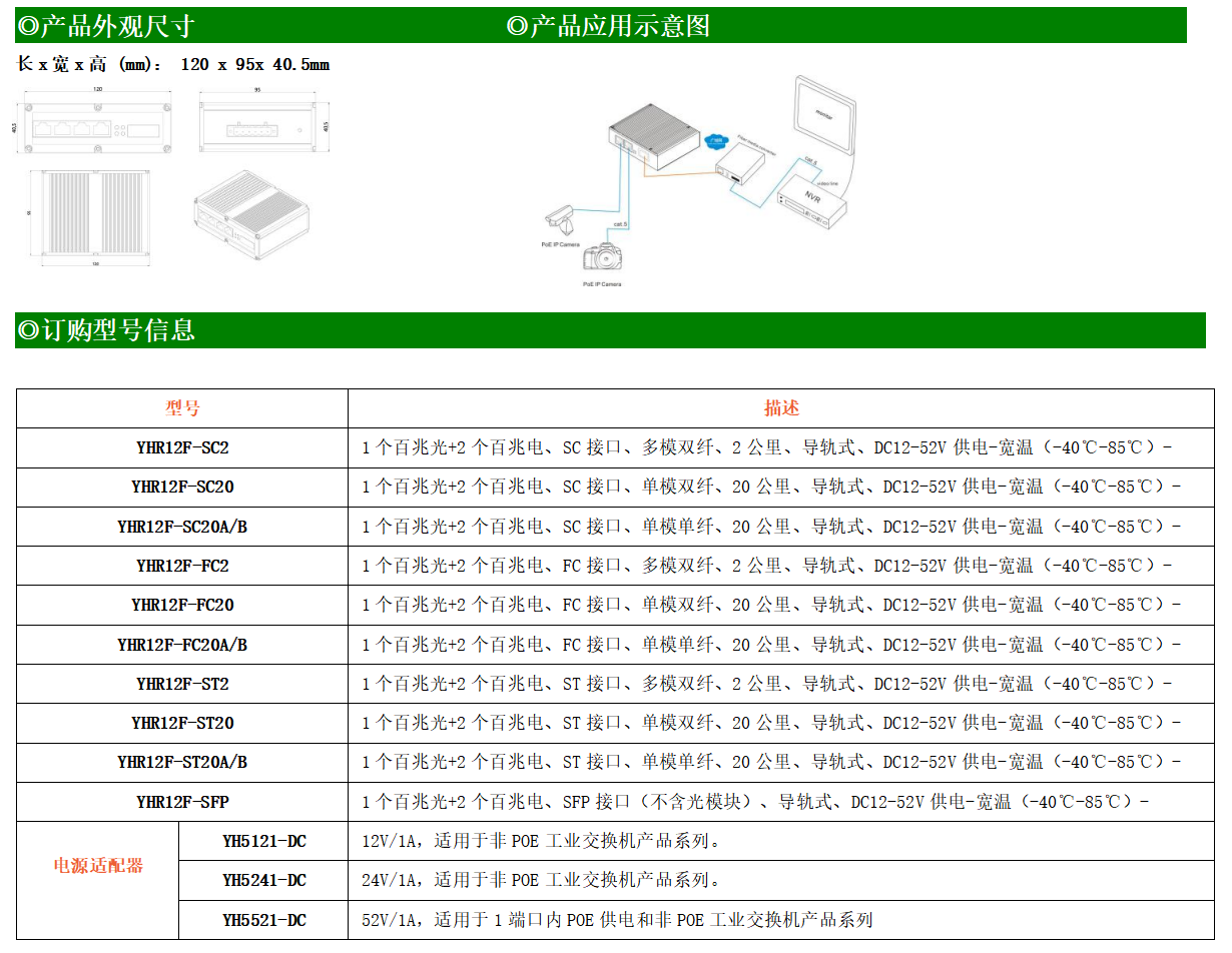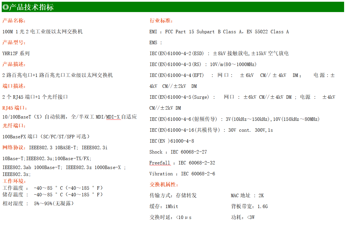 2路百兆電口+1路百兆FX光口工業(yè)級以太網交換機,支持2個10Base-T/100Base-TX電口和1個100Base-X光口。產品符合FCC、CE、ROHS標準。YHR12F系列交換機具有-40℃~85℃的工作溫度,具有超強的堅固度能適應各種嚴苛環(huán)境,也可以非常方便的安置在空間緊湊的控制箱中。導軌的安裝特性、寬溫操作及擁有IP40防護等級的外殼及LED指示燈,使YH200-12F成為一個即插即用的工業(yè)級設備,為用戶的以太網設備聯網提供可靠、便捷的解決方案。