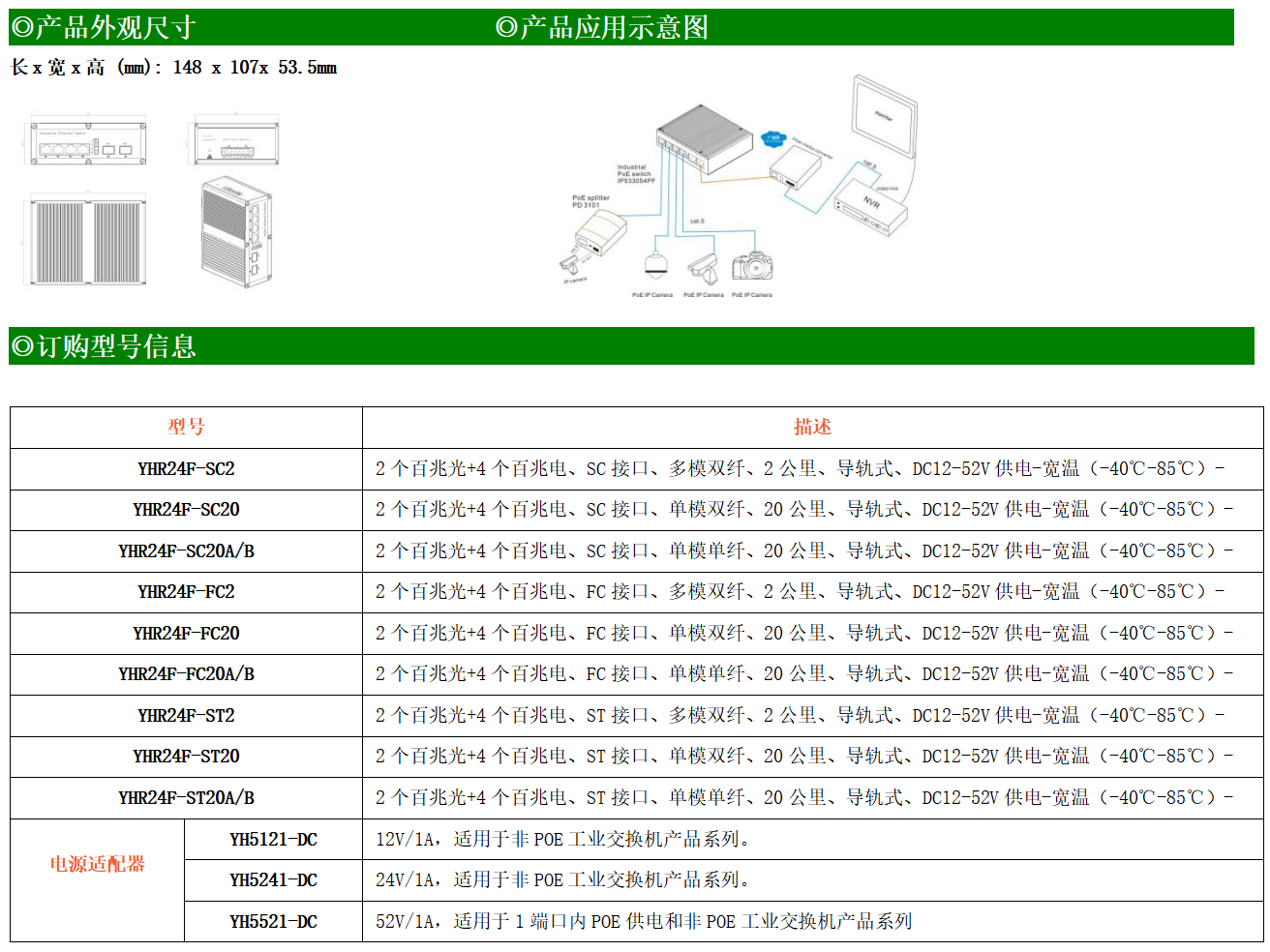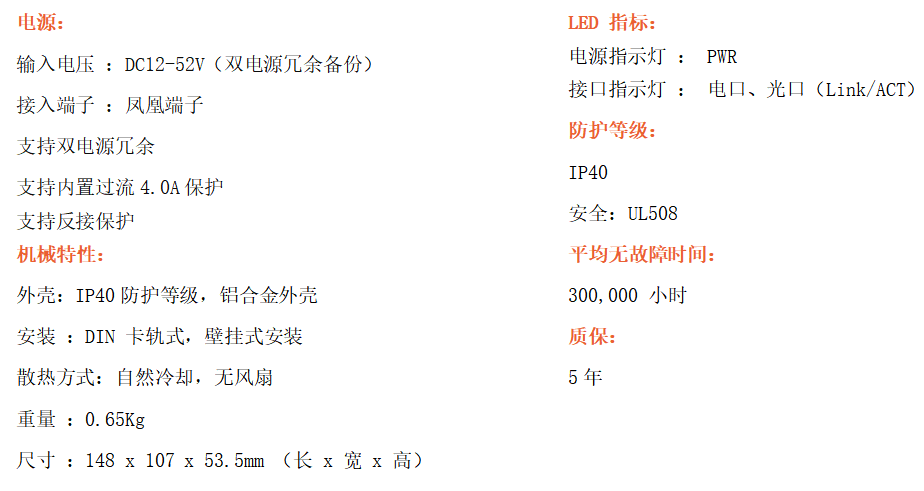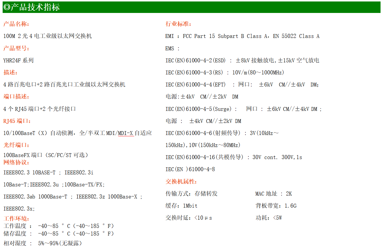 4路百兆電口+2路百兆FX光口工業級以太網交換機,支持4個10Base-T/100Base-TX電口和2個100Base-X光口。產品符合FCC、CE、ROHS標準。YH200-24F系列交換機具有-40℃~85℃的工作溫度,具有超強的堅固度能適應各種嚴苛環境,也可以非常方便的安置在空間緊湊的控制箱中。導軌的安裝特性、寬溫操作及擁有IP40防護等級的外殼及LED指示燈,使YH200-24F成為一個即插即用的工業級設備,為用戶的以太網設備聯網提供可靠、便捷的解決方案。