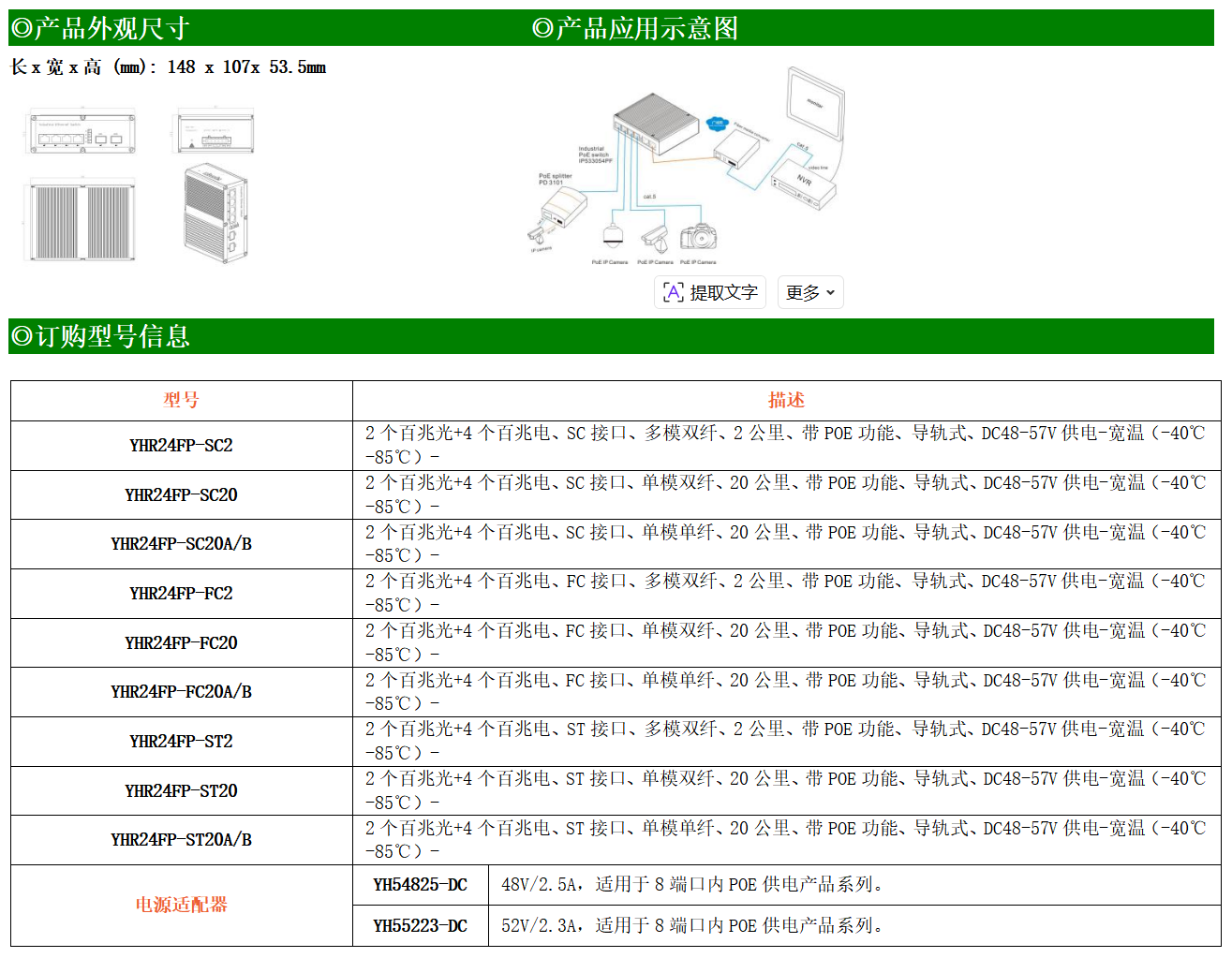 4路百兆POE電口+2路百兆FX光口工業級以太網交換機,支持4個10Base-T/100Base-TX電口和2個100Base-X光口。產品符合FCC、CE、ROHS標準。YH200-24FP系列交換機具有-40℃~85℃的工作溫度,具有超強的堅固度能適應各種嚴苛環境,也可以非常方便的安置在空間緊湊的控制箱中。導軌的安裝特性、寬溫操作及擁有IP40防護等級的外殼及LED指示燈,使YH200-24FP成為一個即插即用的工業級設備,為用戶的以太網設備聯網提供可靠、便捷的解決方案。