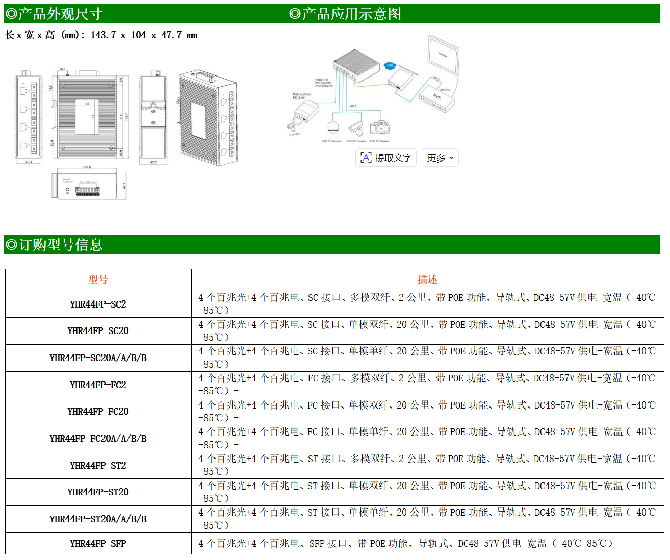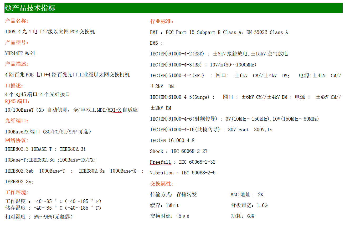 4路百兆POE電口+4路百兆FX光口工業(yè)級以太網(wǎng)交換機,支持4個10Base-T/100Base-TX電口和4個100Base-X光口。產(chǎn)品符合FCC、CE、ROHS標(biāo)準(zhǔn)。YH200-44FP系列交換機具有-40℃~85℃的工作溫度,具有超強的堅固度能適應(yīng)各種嚴(yán)苛環(huán)境,也可以非常方便的安置在空間緊湊的控制箱中。導(dǎo)軌的安裝特性、寬溫操作及擁有IP40防護(hù)等級的外殼及LED指示燈,使YH200-44FP成為一個即插即用的工業(yè)級設(shè)備,為用戶的以太網(wǎng)設(shè)備聯(lián)網(wǎng)提供可靠、便捷的解決方案。
