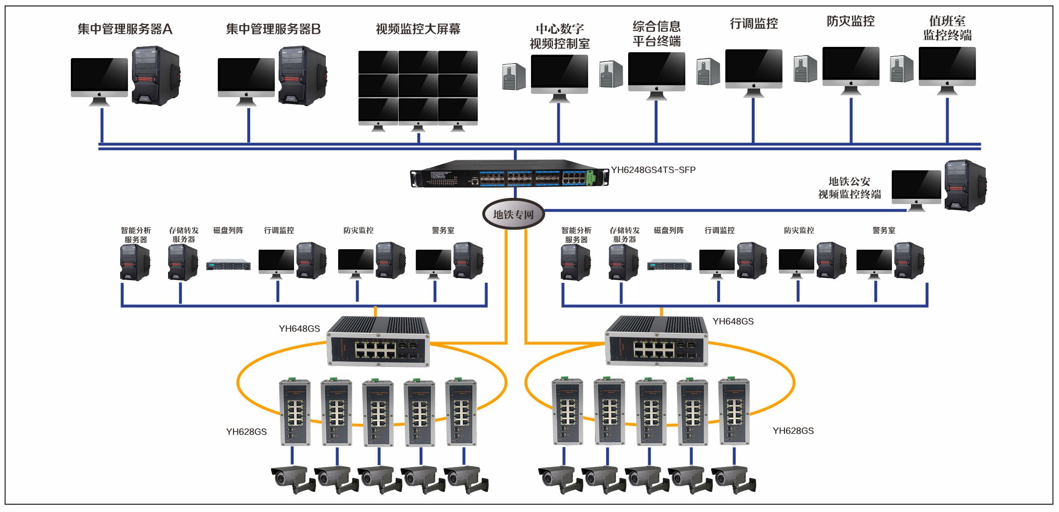 宇航在地鐵IP視頻監控解決方案中采用了YH6248GS-SFP,YH628GS,地鐵視頻監控系統分為兩部分:運營視頻監控和公安視頻監控。運營的調度員需要實時監控車站,車內客流及乘客上下車等情況,以確保運營安全,快捷,準時,在發生緊急情況,如火災,反恐,自然災害等,可為相關人員提供事發現場實時的圖像。在軌道交通設備監控系統解決方案中采用維修與備用中心采用環網交換機進行環網冗余連接,線路中心BAS系統采用核心交換機主設備連接模式與核心交換機相連,保障了各個監控點監控到位,與正常通信提高網絡數據傳輸高效性。